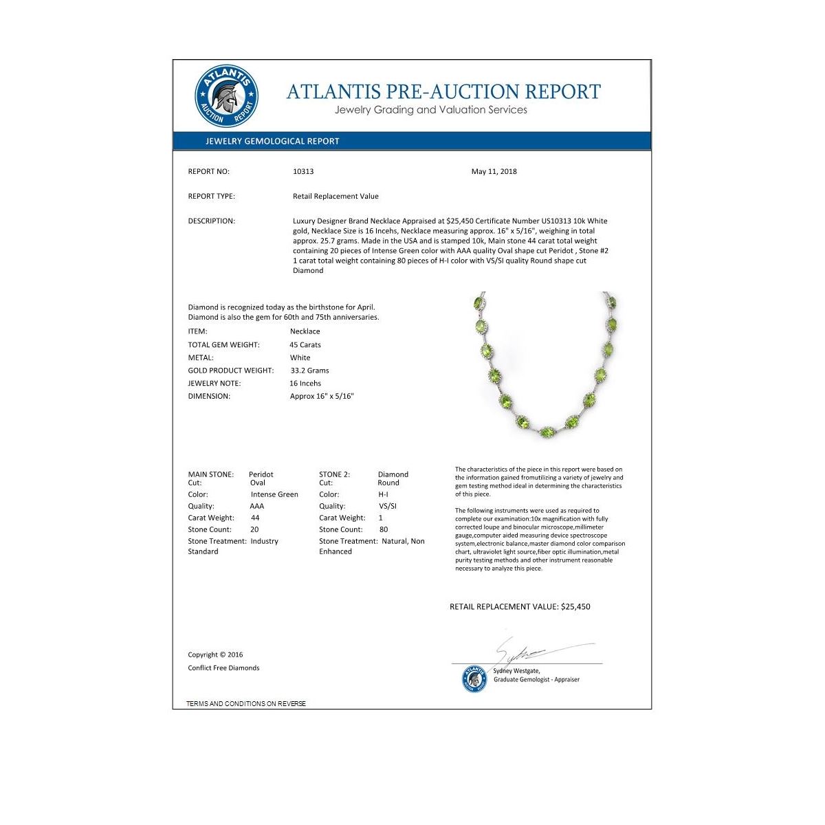 REF-356T2M -10313 ---- 45.0 CTW Peridot & Diamond Necklace 10K White Gold ---- Luxury Designer Brand Necklace Appraised at $25,450 Certificate Number US10313 10k White gold, Necklace Size is 16 Incehs, Necklace measuring approx. 16" x 5/16", weighing in total approx. 25.7 grams. Made in the USA and is stamped 10k, Main stone 44 carat total weight containing 20 pieces of Intense Green color with AAA quality Oval shape cut Peridot , Stone #2 1 carat total weight containing 80 pieces of H-I color with VS/SI quality Round shape cut Diamond