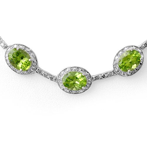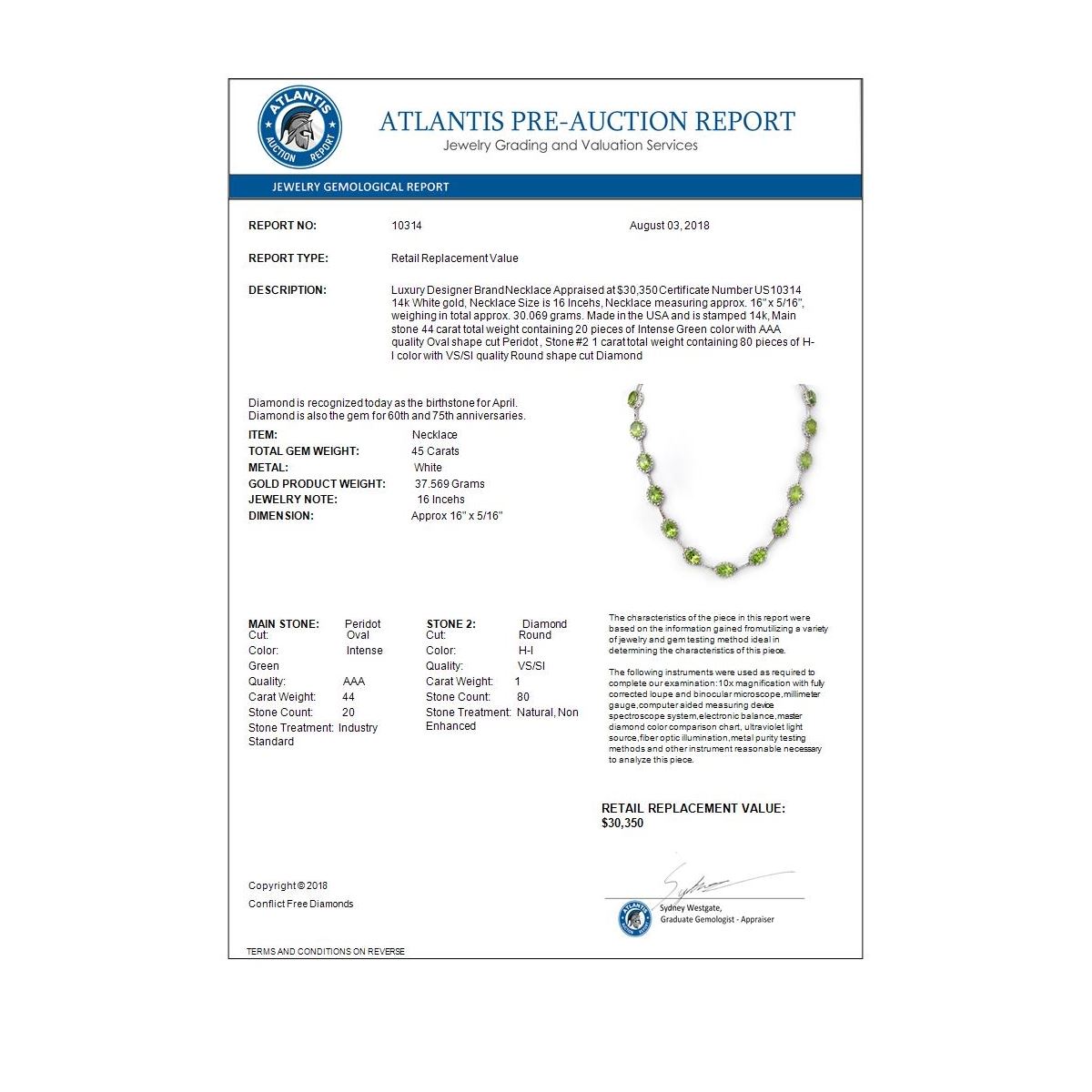 REF-424A4X -10314 ---- 45.0 CTW Peridot & Diamond Necklace 14K White Gold ---- Luxury Designer Brand Necklace Appraised at $30,350 Certificate Number US10314 14k White gold, Necklace Size is 16 Incehs, Necklace measuring approx. 16" x 5/16", weighing in total approx. 30.069 grams. Made in the USA and is stamped 14k, Main stone 44 carat total weight containing 20 pieces of Intense Green color with AAA quality Oval shape cut Peridot , Stone #2 1 carat total weight containing 80 pieces of H-I color with VS/SI quality Round shape cut Diamond