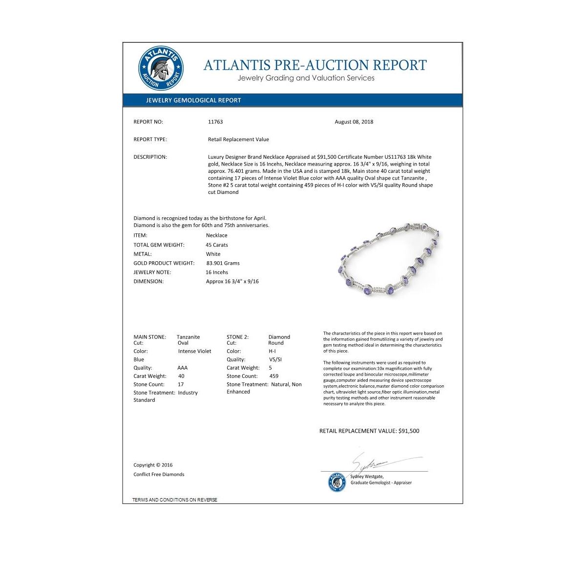 REF-1188W5F -11763 ---- 45.0 CTW Tanzanite & Diamond Necklace 18K White Gold ---- Luxury Designer Brand Necklace Appraised at $91,500 Certificate Number US11763 18k White gold, Necklace Size is 16 Incehs, Necklace measuring approx. 16 3/4" x 9/16, weighing in total approx. 76.401 grams. Made in the USA and is stamped 18k, Main stone 40 carat total weight containing 17 pieces of Intense Violet Blue color with AAA quality Oval shape cut Tanzanite , Stone #2 5 carat total weight containing 459 pieces of H-I color with VS/SI quality Round shape cut Diamond