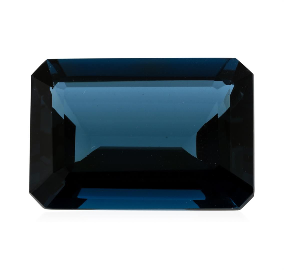 One natural emerald cut london blue topaz with an exact weight of 45.02ct., clarity is eye clean, dark greenish blue. Gemological Appraisals Services estimates the retail value at $1575.7 GAS Appraised.
