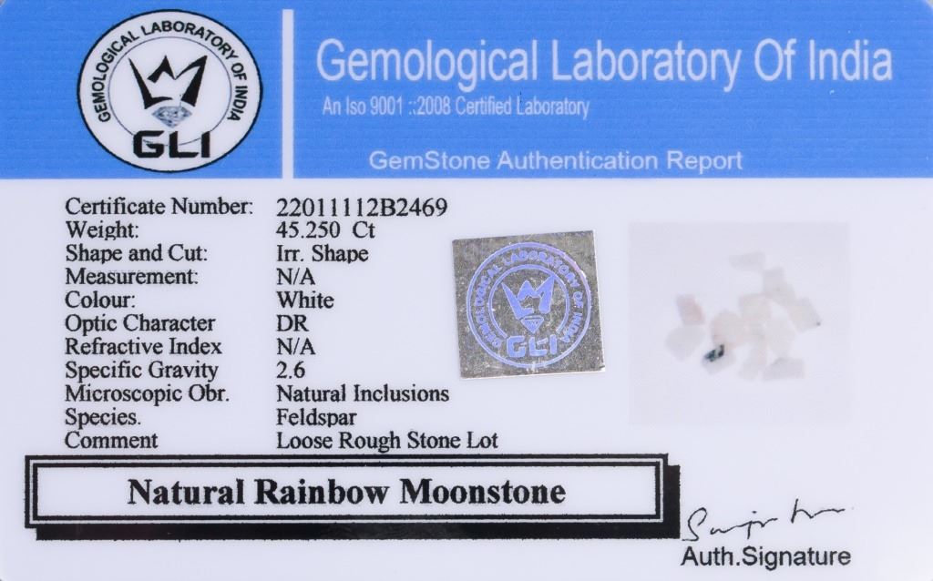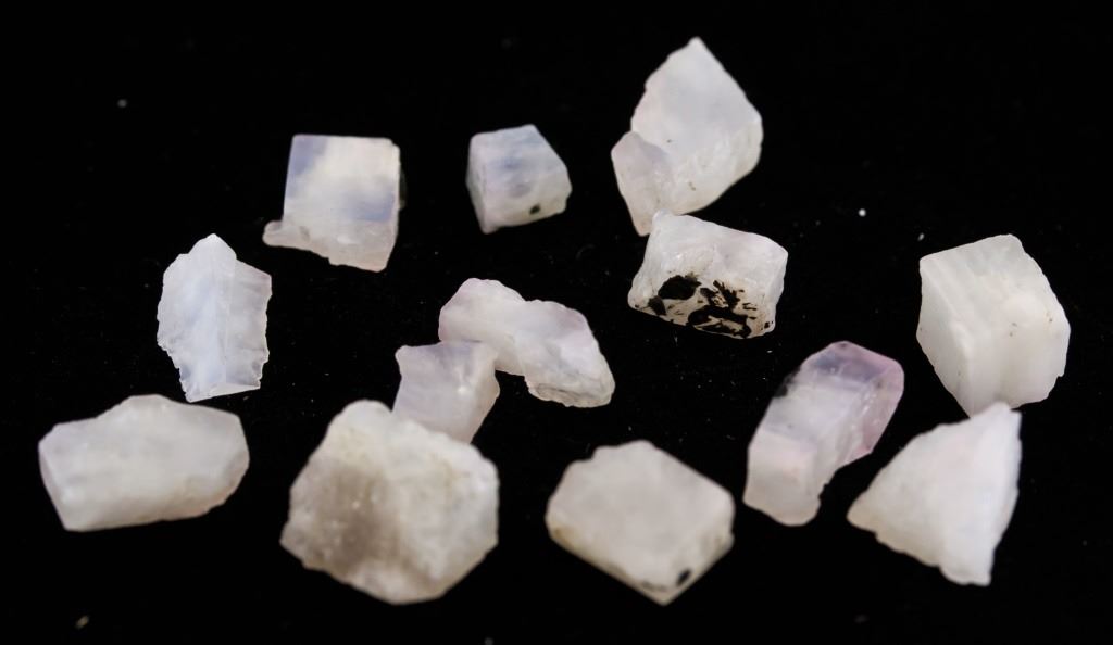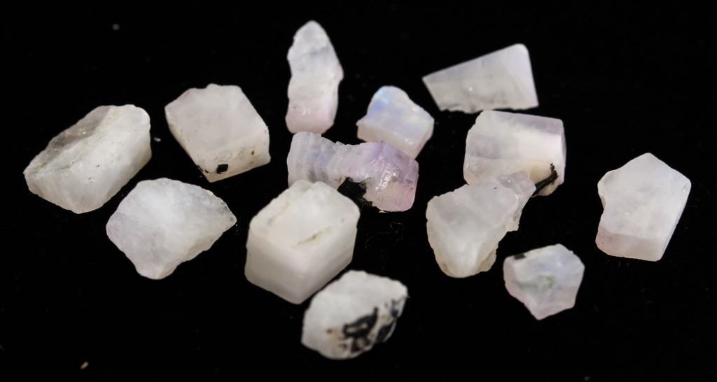 Lot of 13 45.25 ct (total) irregular shape rough white natural rainbow moonstone. Accompanied with GLI certificate.