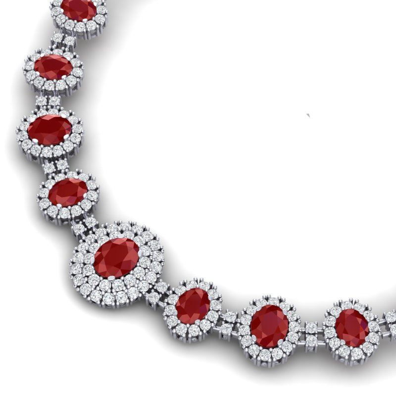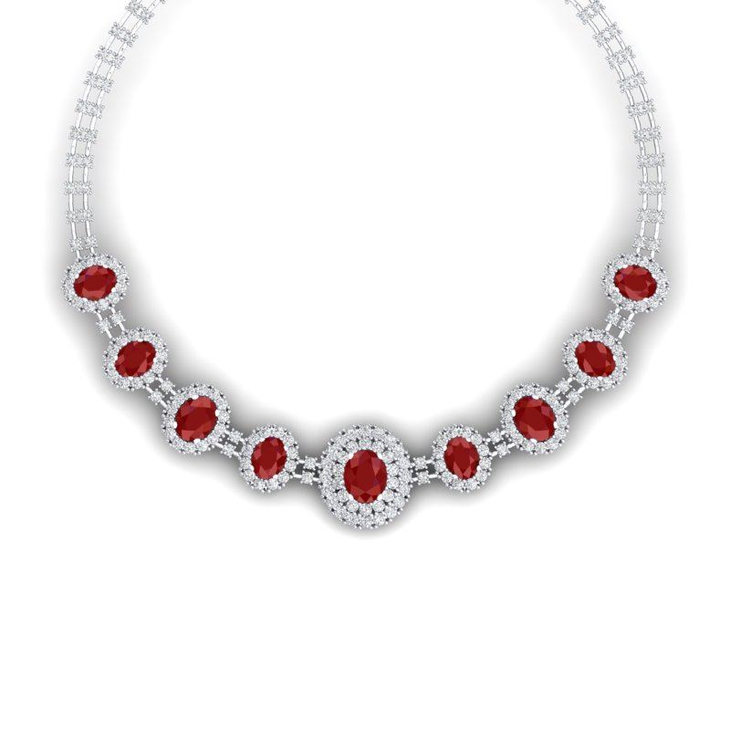 45.69 CTW Royalty Ruby & VS Diamond Necklace 18K White Gold ---- Luxury Designer Brand Necklace Appraised Retail Price at $124,600 ---- SKU Number US38793 18K White gold Necklace Size is 16 Inches, Can custom fit length, Necklace measuring approx. 4 1/2 x 3/4 Inches, weighing in total approx. 55 grams. Made in the USA and is stamped 18K, Main stone 3.89 carat total weight containing 1 pieces of Intense Mid-Opaque Red color with AAA quality Oval shape cut Ruby , Stone #2 21.8 carat total weight containing 8 pieces of Intense Mid-Opaque Red color with AAA quality Oval shape cut