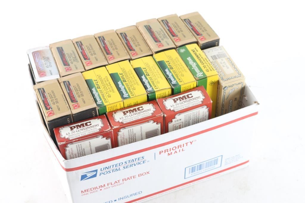 Approx. 380 rounds of factory new 45-70 Gov't ammunition. Approx. 200 rnds of Hornady 325 Gr., approx. 100 rnds of Remington 300 Gr., approx. 60 rnds of PMC 405 Gr. & 20 rnds of Ten-X 405 Gr. All in factory boxes.
