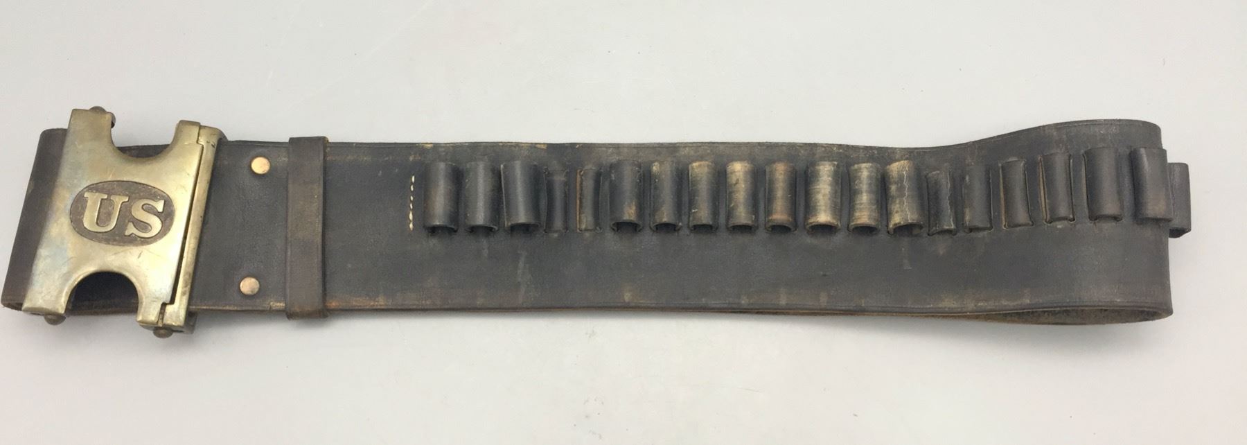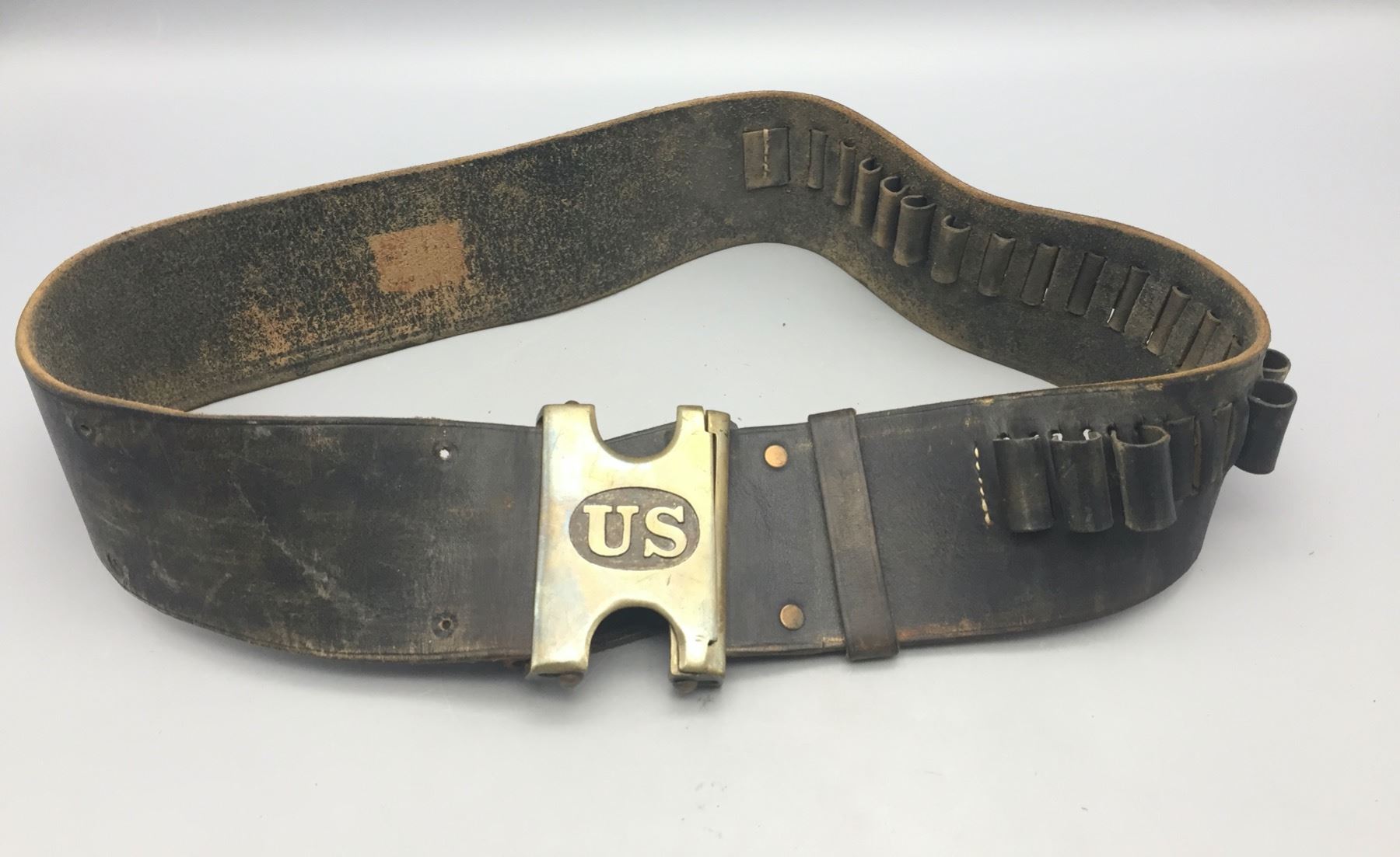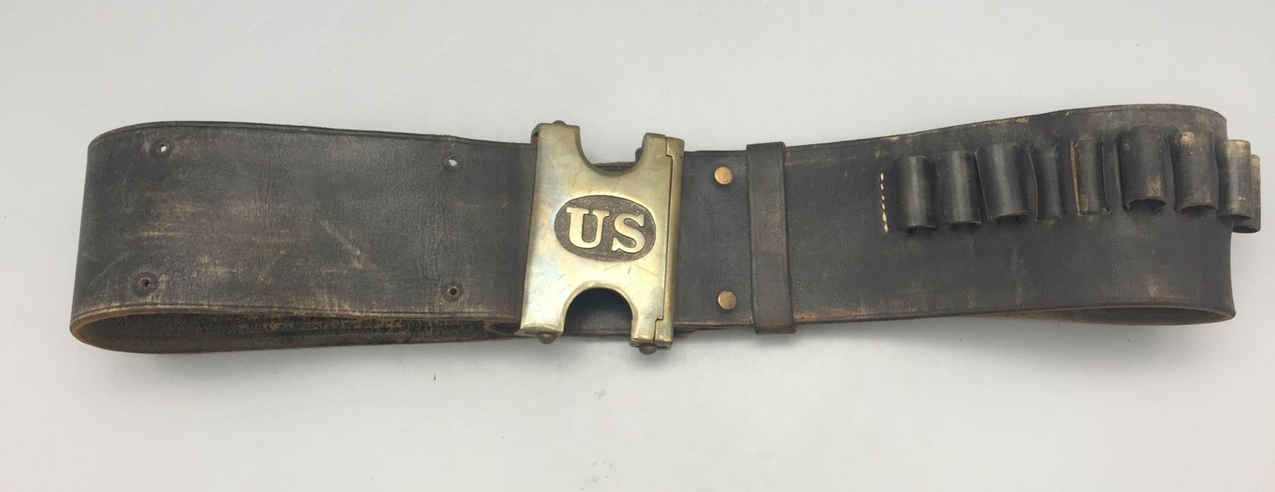 Description: Presented for sale in this lot is an Indian Wars era US marked leather cartridge belt with original buckle. It is for the .45-70 Springfield Trapdoor rifle cartridges. Maker: Unknown. Approx. Age: Late 1800s. Size: 38” long x 3” wide. Condition: Pretty good for its age, normal wear expected. Please look closely at the pictures - they are an important part of our description. Shipping: There will be a $5 handling / packaging fee for shipping this lot. The actual cost of postage will be added on top of that.
