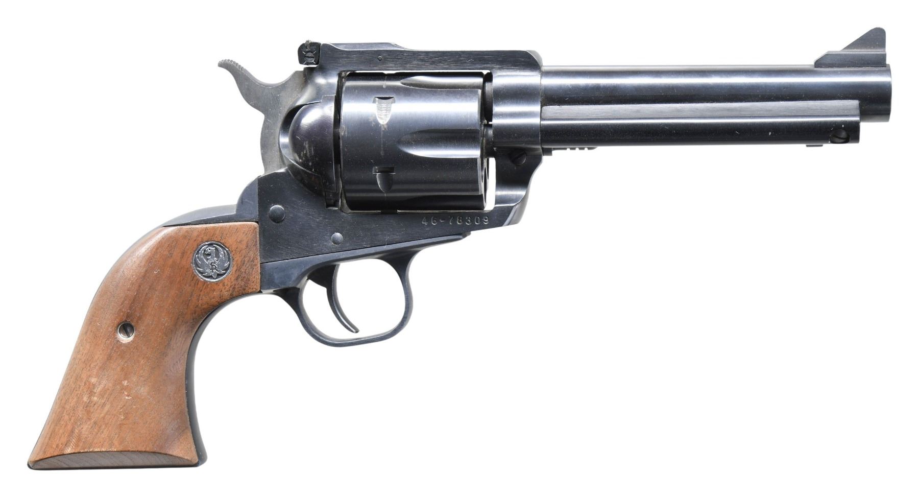 Cal. 45 ACP. S# 46-78309. Mfg. 1981. Appears to be Convertible Model, but without 45 LC cyl. Replacement 5" barrel without any markings. Matching numbered 6 shot fluted cyl. Blue & Black finish. XRN-3RED frame with Ruger walnut grips. CONDITION: over 95% blue & black finish showing light handling marks. Very good grips. Very good bore. (25-3657/MD). MODERN. $300-450.