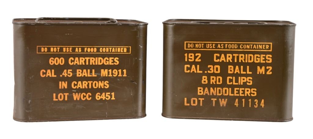 In sealed military spam cans. 45 ACP - 600 rds. .30 cal M2 - 192 rds. in 8rd. clips.