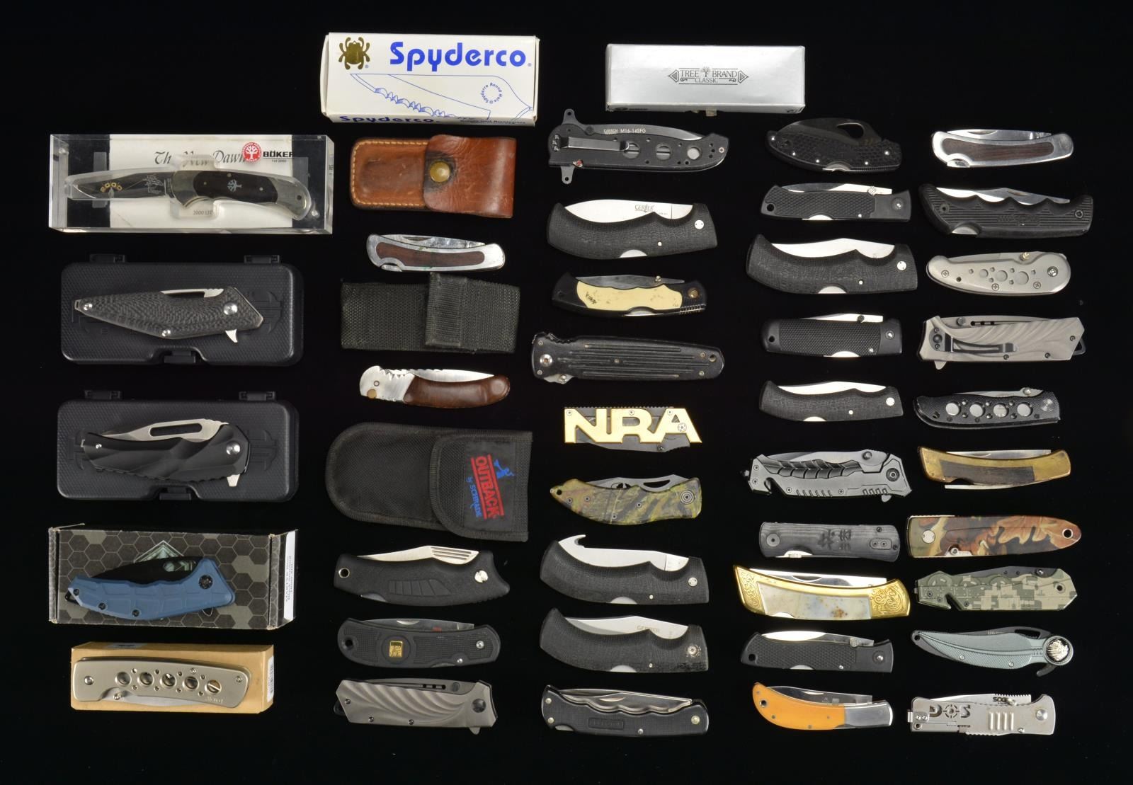 Makers include Al Mar, Spiderco, Boker, Brous Blades, Columbia River, & Gerber. Wide range of blade lengths & styles. Handles range from all metal to varying colors of synthetics. Notable examples include: 1 Boker New Dawn in clear plastic display case. / 1 Spiderco “Blue Line” Peter Herbst. / 1 Heretic Arms Martyr blue w/ box & pouch. / 2 Brous Blade knives w/ plastic hard case & Certificates of Authenticity. / 4 Gerber folders in various styles w/ black contoured handles. / 1 Al Mar DTS 34. / 1 Gerber Rex Applegate & R Fairbairn. CONDITION: ranges from good to new in factory packaging, may have light wear, staining & scratches. Factory packaging may have scuffing & light wear. (02-14639-4/RW). $400-600.