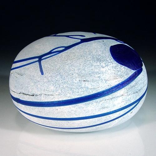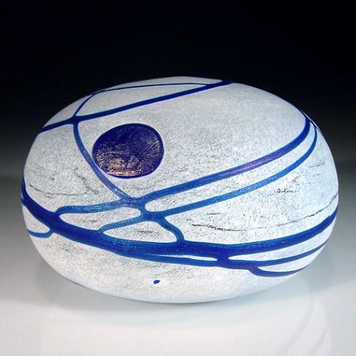 Boda Artist Collection surface design paperweight, with two blue circles and swirling blue lines on semi-opaque white. Signed. Diameter 3 1/8". NO RESERVE