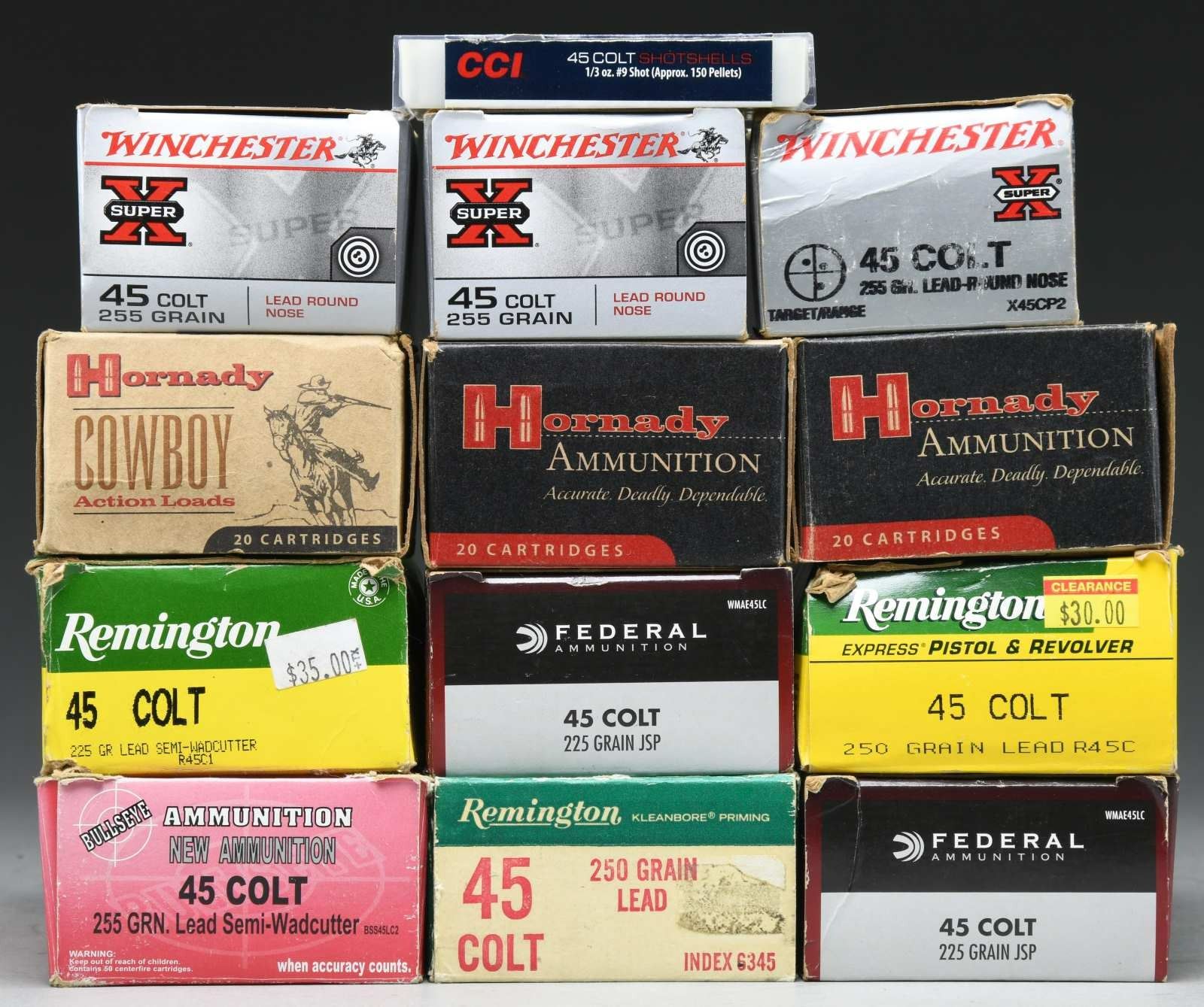 This lot consists of six full boxes & seven eight partial boxes of 45 Colt ammo. The full boxes are as follows: two 20 rd boxes of Winchester 255 grain lead round nose, two 20 rd. boxes of 225 grain Hornady Levereolvution, one 50 rd. box of Remington Express 250 grain lead nose & one 50 rd. box of Federal 225 grain JSP. The partial boxes are as follows: one 8 rd. box of CCI Shotshells, one 16 rd. box of Hornady 250 grain Cowboy Action loads, next is an 18 rd. box of Winchester 255 grain lead round nose, next is a 29 rd. box of Remington 225 grain lead round nose, next is a 25 rd. box of Remington Kleanbore 250 grain lead round nose, next is a 45 rd. box of Federal 225 JSP & finally is a mixed box of 43 rds including 33 rds of Bullseye 255 grain semi wadcutter, 4 rds. of CCI hollowpoint & six rounds of Winchester hollowpoint. All rounds appear to be in very good condition. (02-19748-4/MJC). $300-500.