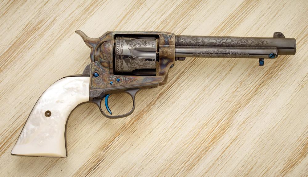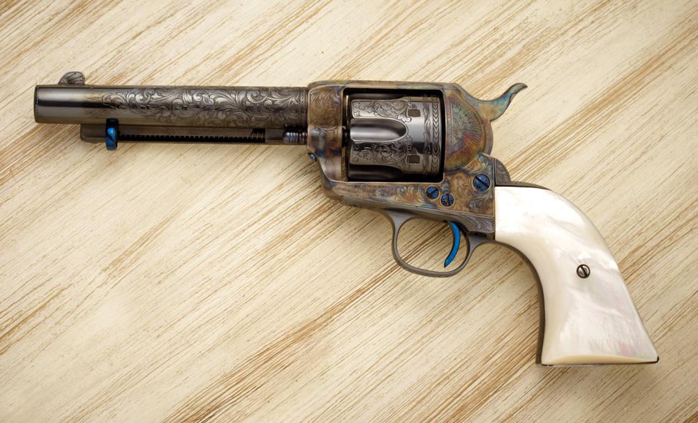 5 1/2” bbl with pearl grips. Engraved, by Ken Hurst, refinished and signed, Ser #44075. Shipped by Colt March 14, 1878. Includes a 1970 Colt factory letter, plus a letter from Ken Hurst, formerly of the Colt Custom Shop in Hartford, CT, the engraver who artistically interpreted, executed and refinished