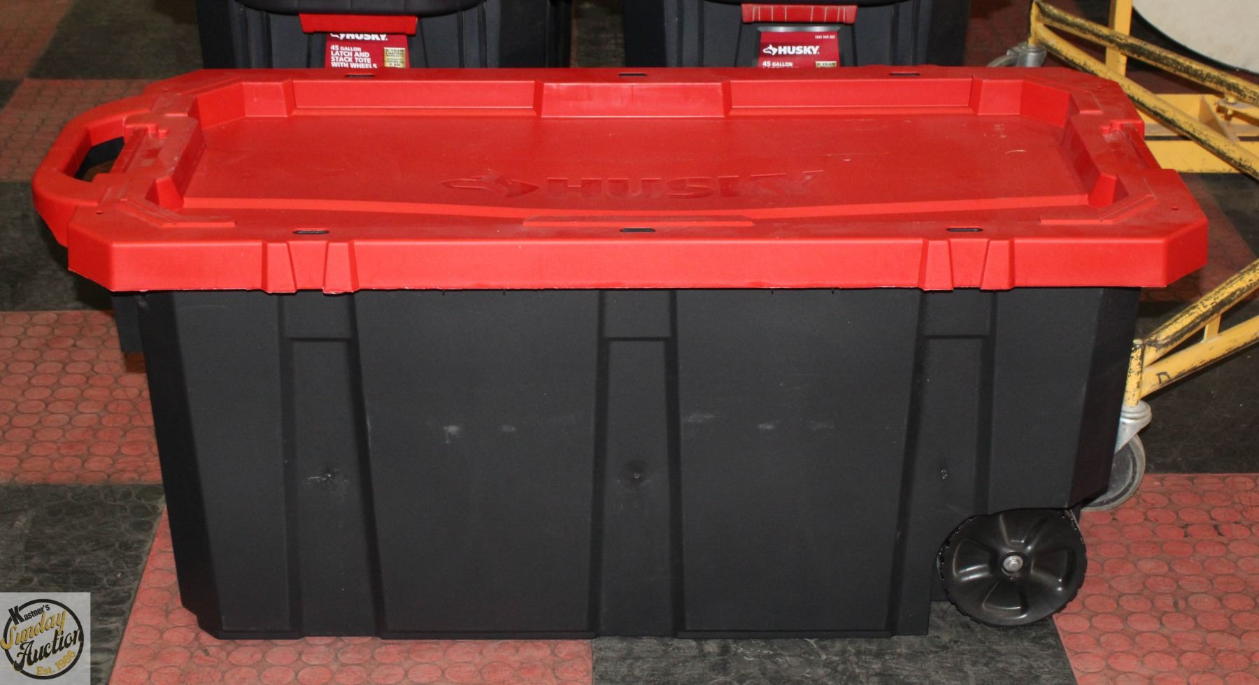 45 GALLON HUSKY ROLLING TOTE WITH LATCHES
