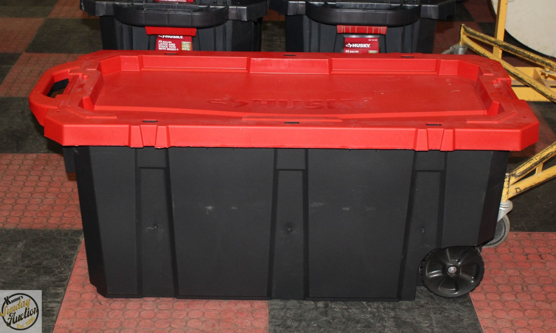 45 GALLON HUSKY ROLLING TOTE WITH LATCHES