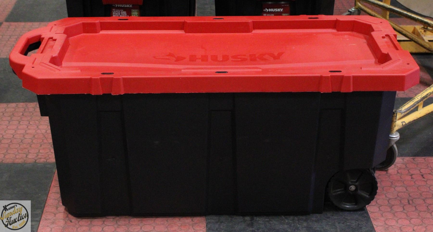 45 GALLON HUSKY ROLLING TOTE WITH LATCHES