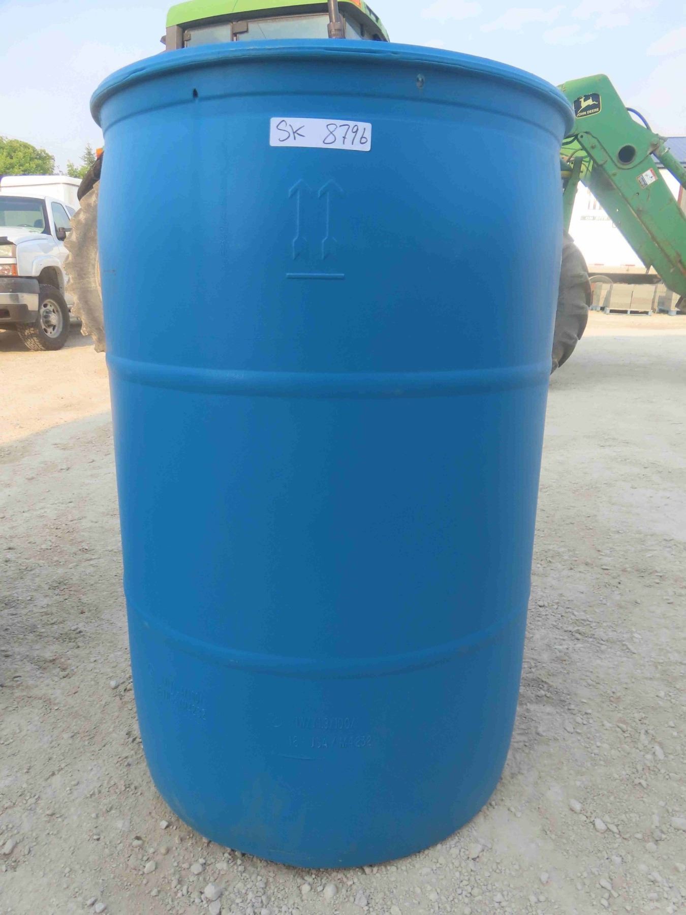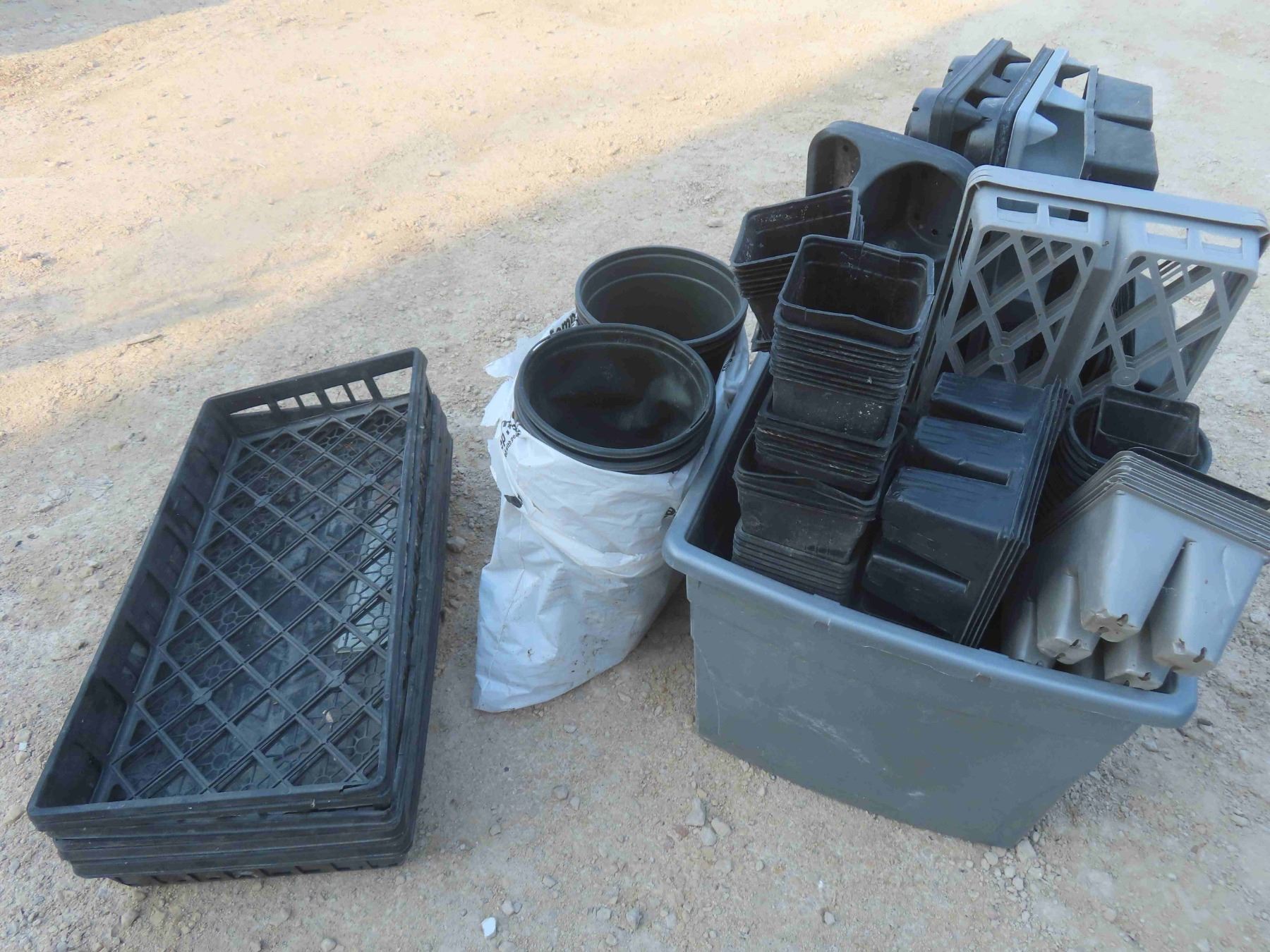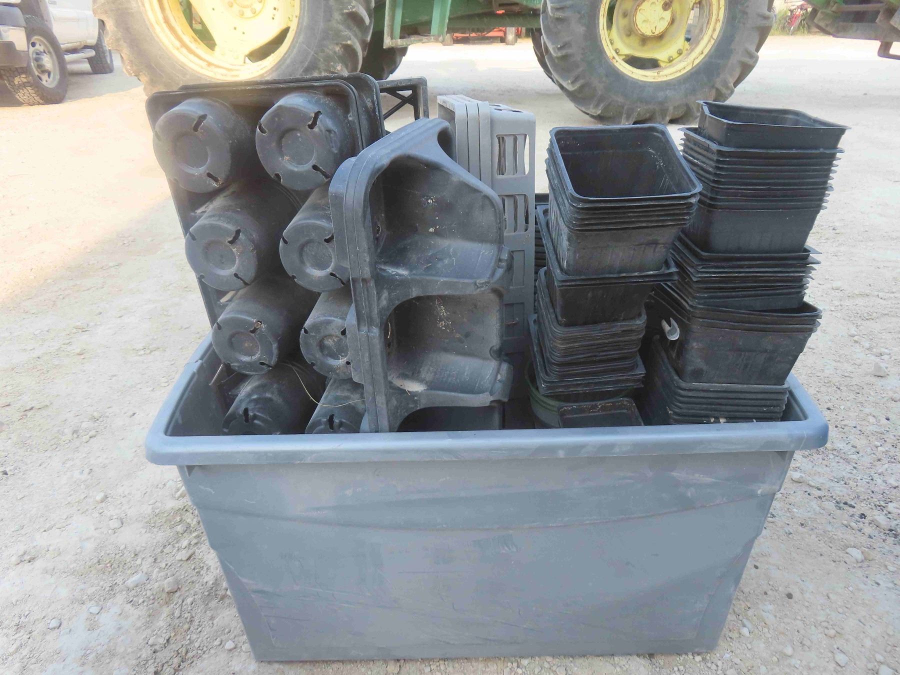 45 Gallon Poly Barrel with Quanity of Plastic Plant Pots