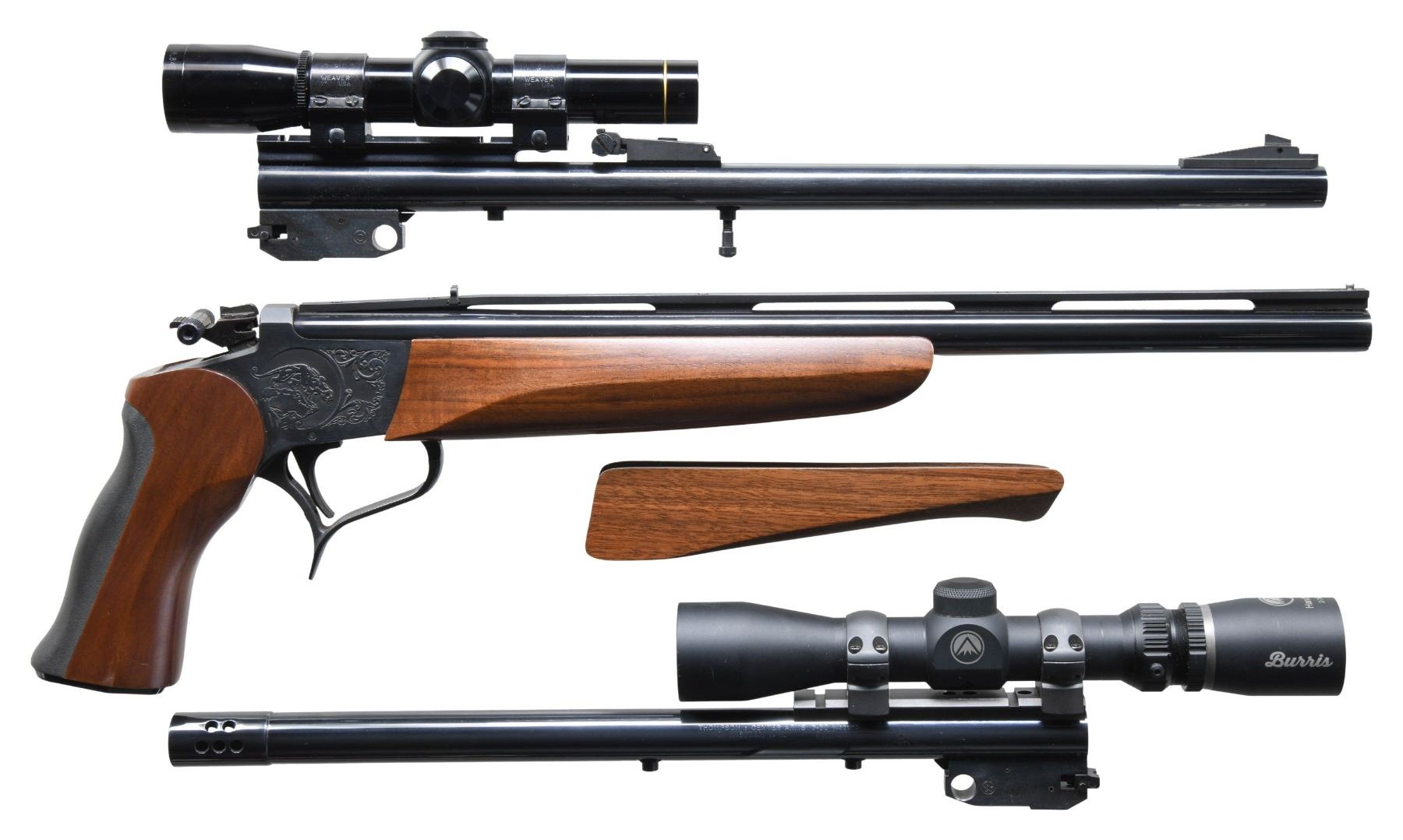 SINGLE SHOT PISTOL 3 BARREL SET. Cal. 410/45 LC, 7-30 Waters & .223 Rem. S# 392906. Barrel 1 (410 / 45 LC) Super 16" VR w/ bright bead & U notch rear sight; bore is rifled with choke at end. Barrel 2 (7-30 Waters) Super 14 with ported muzzle brake & Burris 2-7x32 Handgun, duplex scope on rings & barrel mounted base. Barrel 3 (.223 Rem) Super 16 barrel with Blade front sight, adj. rear sight & Leupold M8-2x EER Shotgun, duplex reticle scope. Blued finish. Smooth walnut stock set w/ black rubber backstrap pad. UNATTACHED ACCESSORIES: slim walnut forearm. Barrels 2 & 3. CONDITION: all aspects appear very good to near excellent showing light handling marks. Very good bores with strong rifling. Very good to near excellent scope finishes w/ serviceable optics. (25-4043/MD). MODERN. $700-1,000.