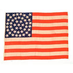 45 STAR AMERICAN PARADE FLAG. 17" x 23". Printed cotton flag, canton stars are in a medallion configuration showing central star surrounded by three circles of stars and stars in each of four corners. The 45th star commemorates the state of Utah which became a state in 1896. CONDITION: Overall very good with excellent colors. 4-53393 JS27