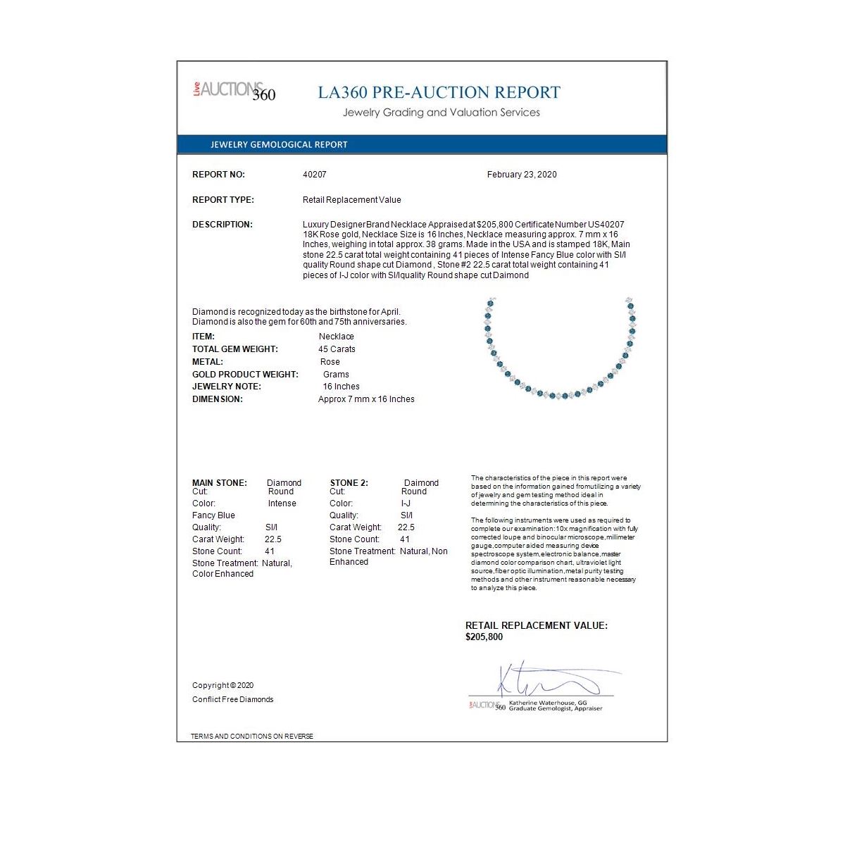 REF-4410N2F - SKU: 40207 ---- 45 ctw Certified SI/I Intense Blue Diamond Necklace 18K Rose Gold
