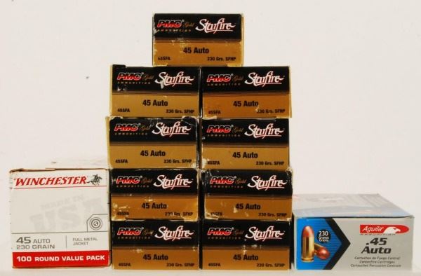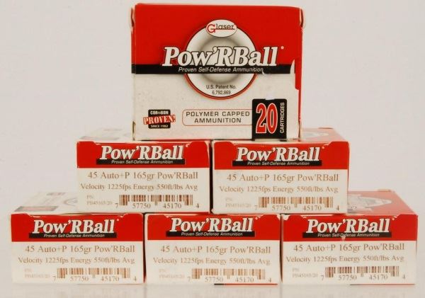 PMC Gold, Remington, & Aguilla Brand. Approximately 330 rounds; Glaser Pow'R Ball .45 Auto Ammo 6 boxes, 20 rounds per box.