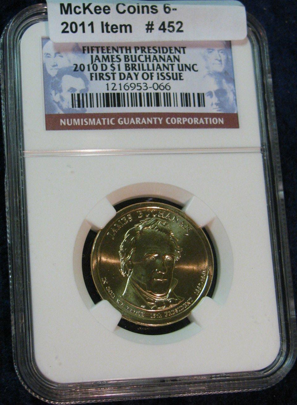452. 2010 D James Buchanan Dollar NGC slabbed BU First Day of Issue.