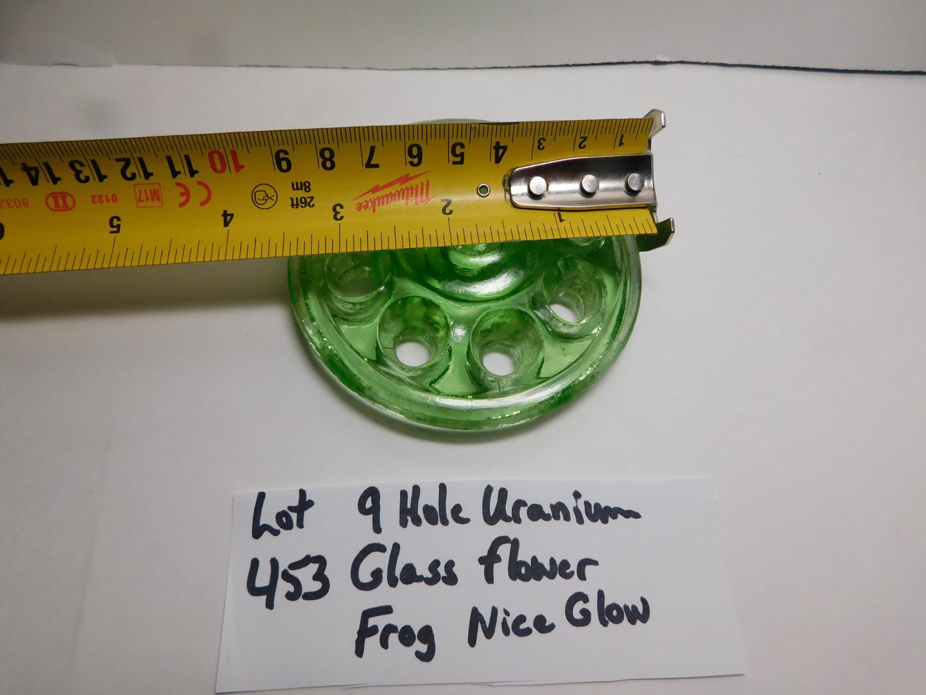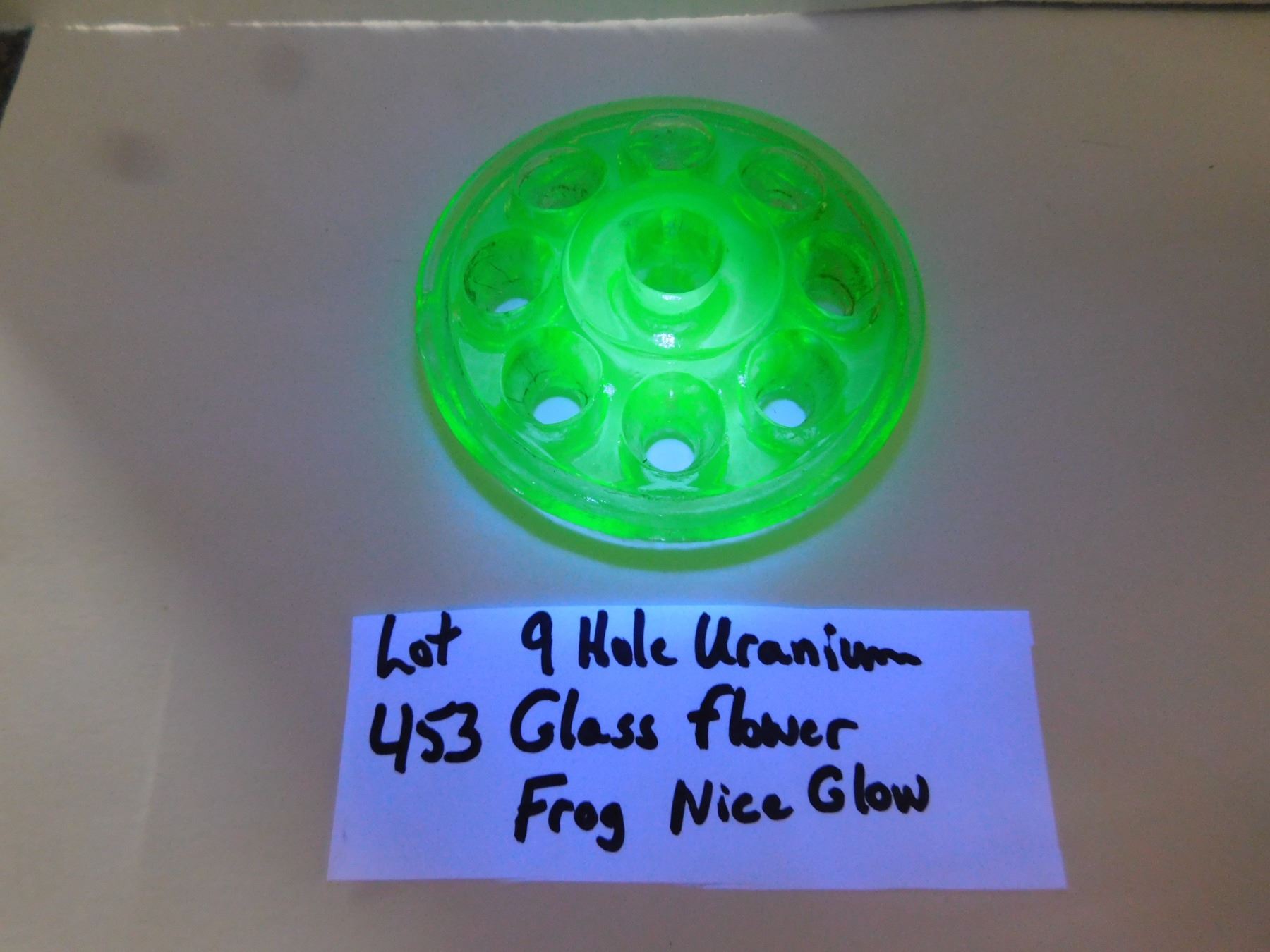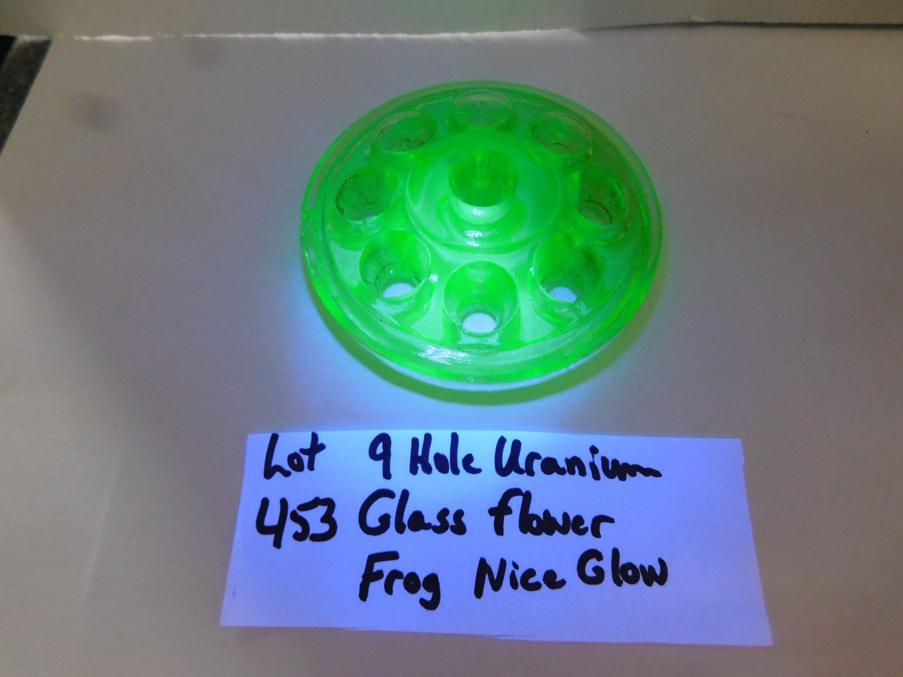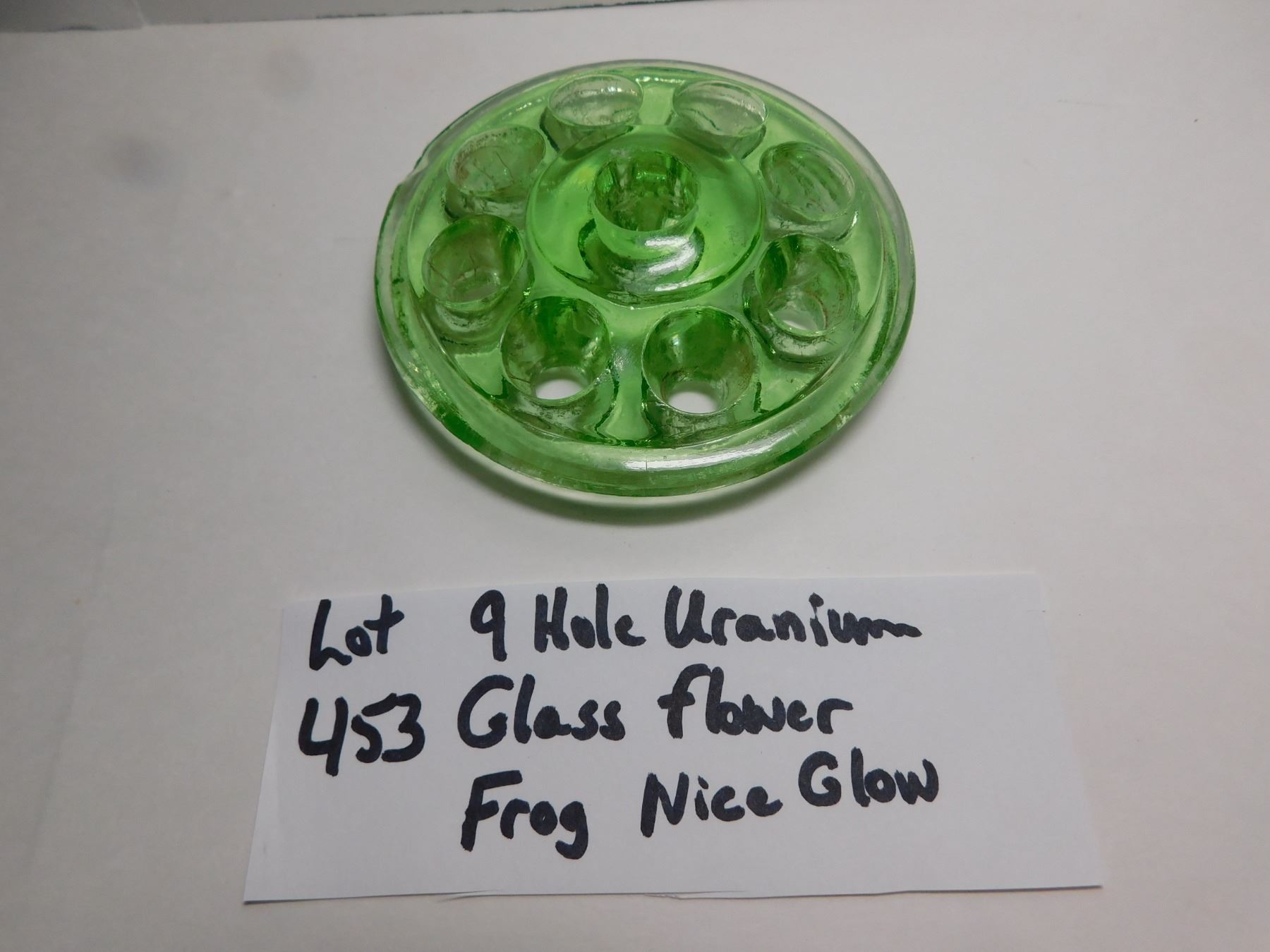 453. 9 HOLE URANIUM GLASS FLOWER FROG, GREAT GLOW