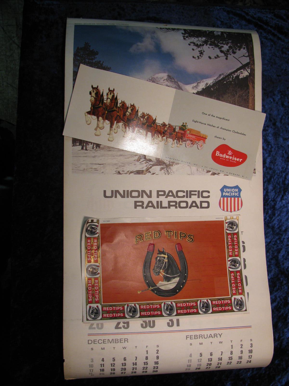 453. Budweiser Clydesdales Advertising Post card; Red Tips Cigar Box Label. Mint condition; & 1973 Union Pacific Railroad Advertising Calendar.