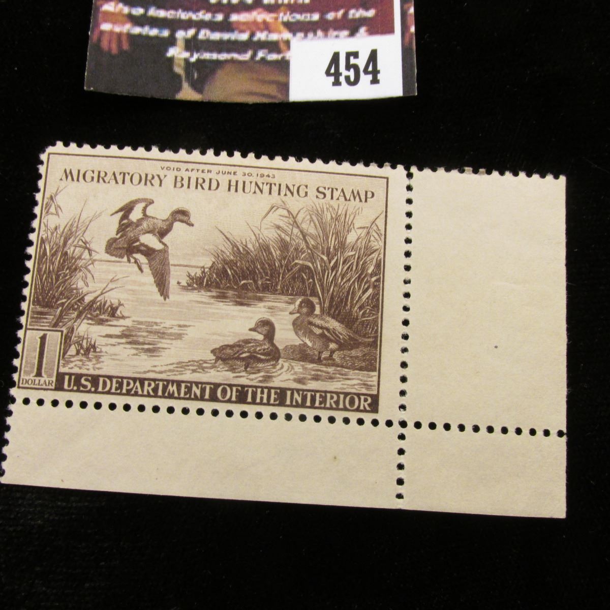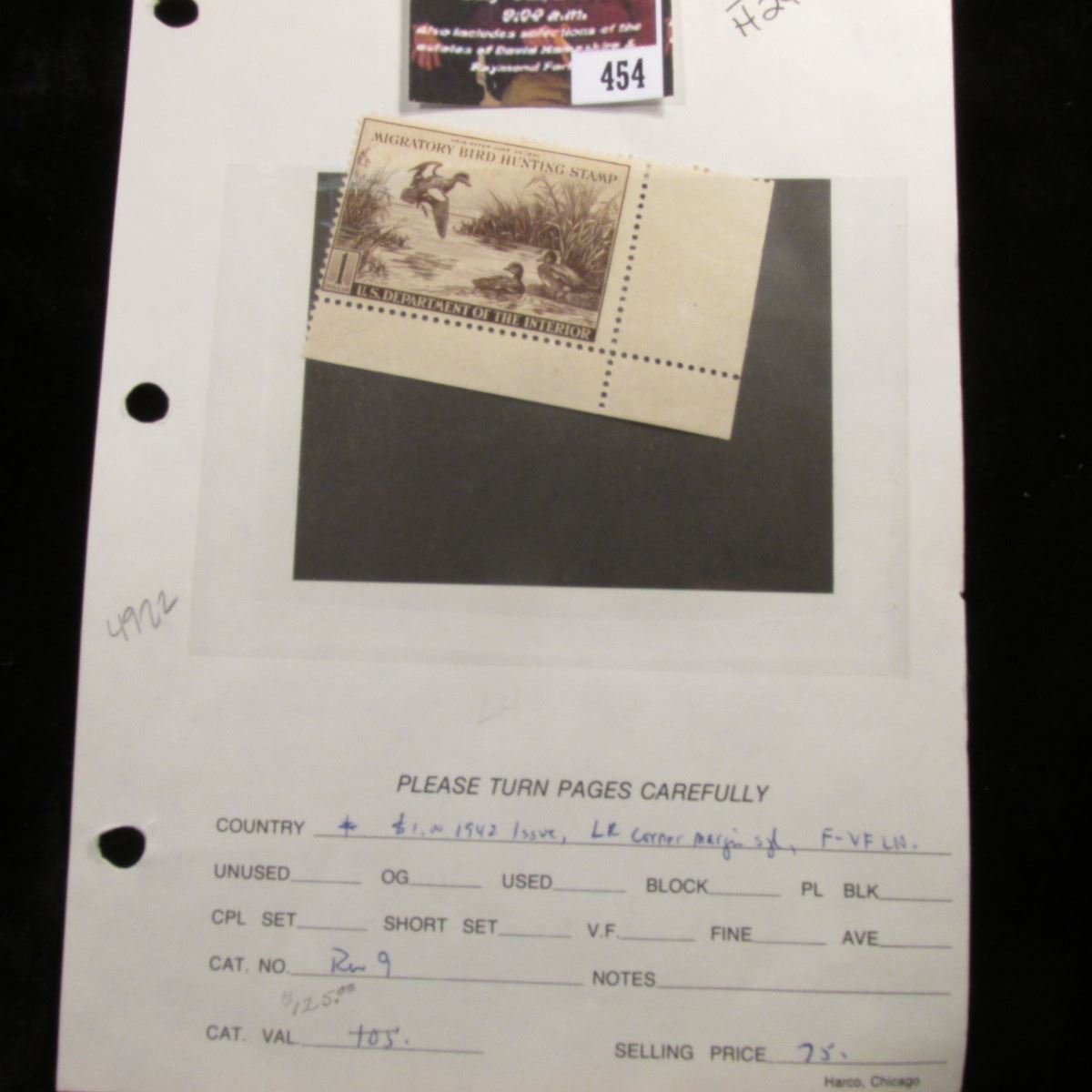 454.1942 U.S. Migratory Bird hunting Stamps, RW9, Unused, Lower right corner margin single, F-VF. Lots of reverse gum.