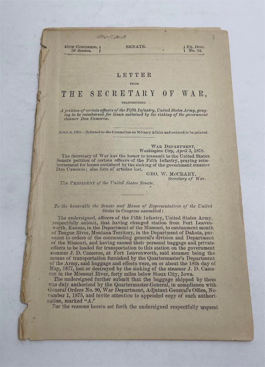 Book is in regards to the Sinking of the Steam Don Cameron and the 5th Infantry wishing for reimbursement in 1878. No cover. Document was part of the 45th Congress 2nd Session of the Montana House of Representatives in 1870.Bob Borcherdt collection. Bigfork, Montana.