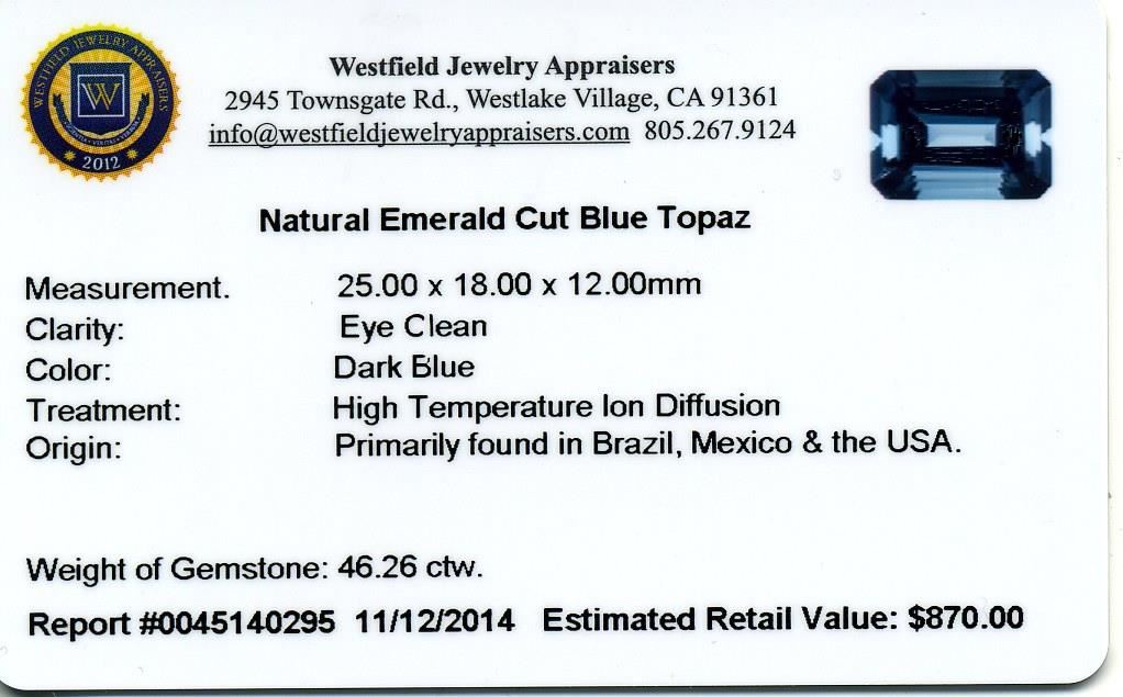 46.26ctw. Natural Emerald Cut Blue Topaz. Westfield Appraised at $870.00.