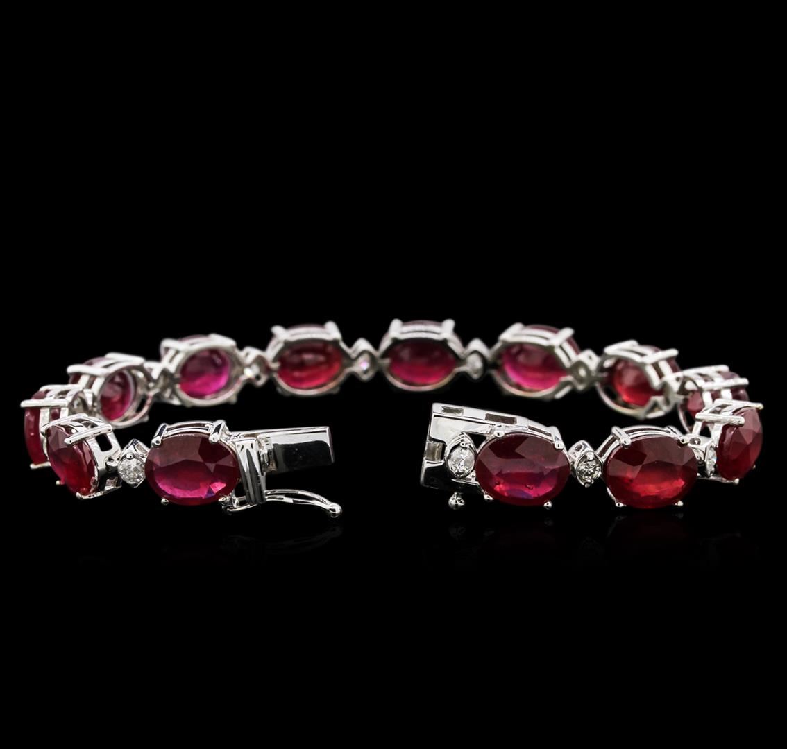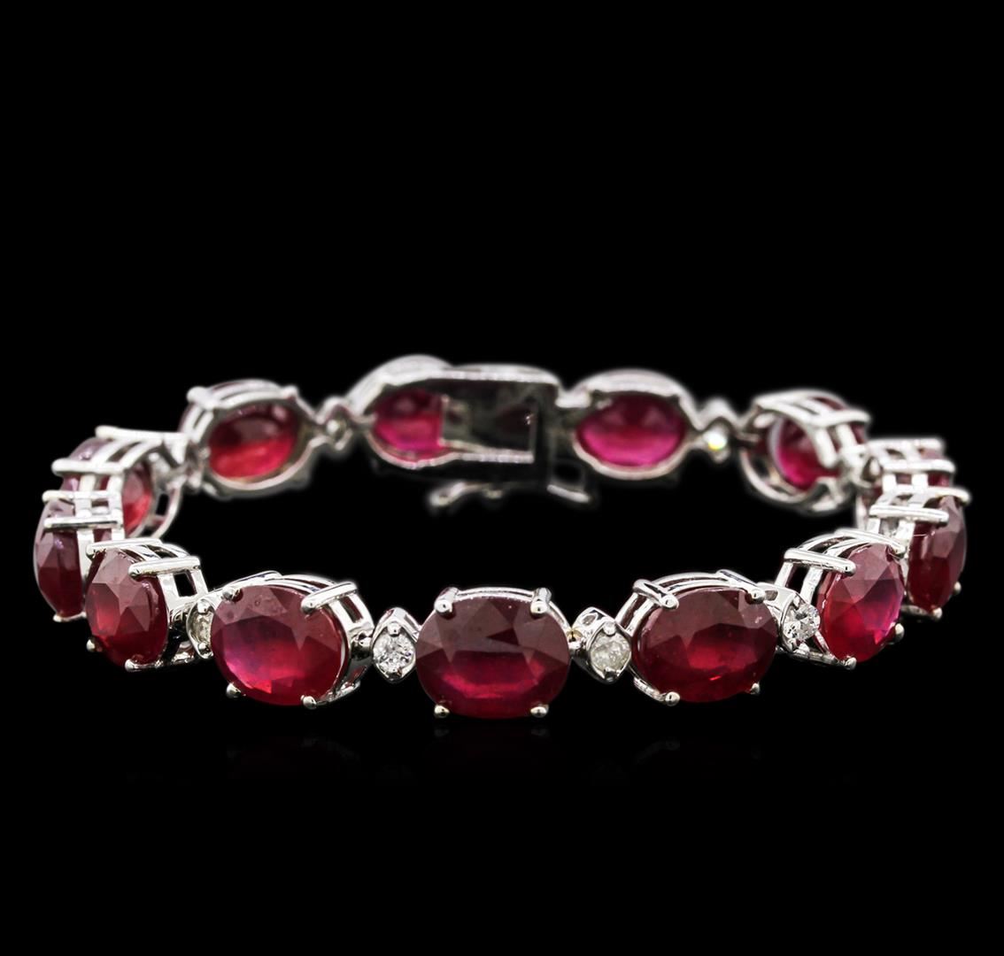 One 14K White Gold Lady's Bracelet. 24.90 GR. 7 Inches. Containing: Main Gemstones: Identity: Natural Corundum. Ruby Color. Carat Weight 46.40 CTS 13PCS. Shape & Measurement: Oval Shape. Approx: 10.00 X 8.00 MM. Quality: Enhanced Quality. Fine Medium Color. Adjacent Gemstones: Identity: Natural Diamond. Shape: Round Cut. 13 PCS Carat Weight: 0.90 CTS TW. Quality: SI Clarity, H-I Color. All Fine Cutting And Proportions. Total Gemstones Weight: 47.30 CTW TW. RBGS Appraised.