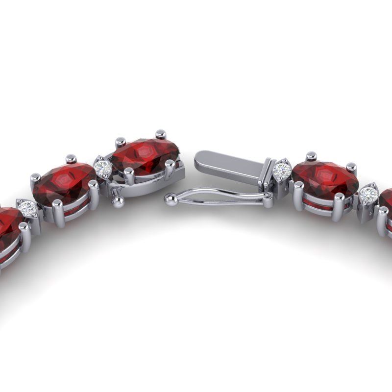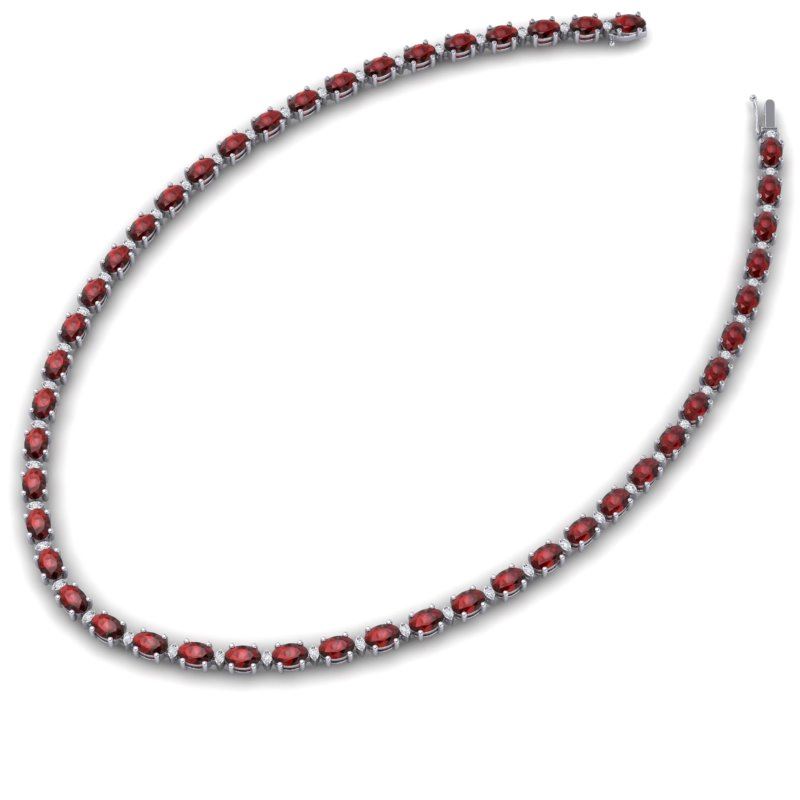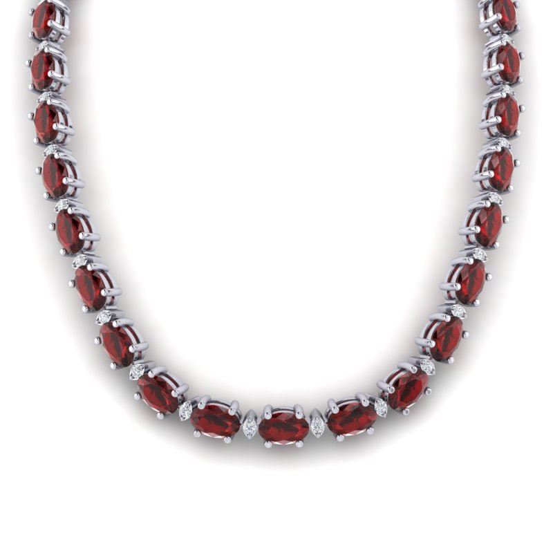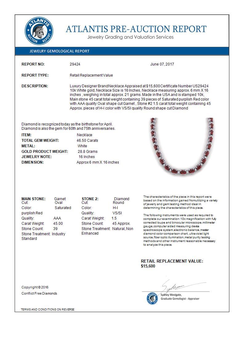 46.5 CTW Garnet & VS/SI Certified Diamond Eternity Necklace 10K White Gold ---- Luxury Designer Brand Necklace Appraised Retail Price at $15,600 ---- SKU Number US29424 10k White gold Necklace Size is 16 Inches, Necklace measuring approx. 6 mm X 16 inches , weighing in total approx. 21 grams. Made in the USA and is stamped 10k, Main stone 45.00 carat total weight containing 39 pieces of Saturated purplish Red color with AAA quality Oval shape cut Garnet , Stone #2 1.5 carat total weight containing 45 Approx. pieces of H-I color with VS/SI quality Round shape cut