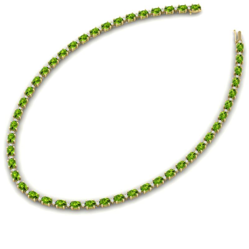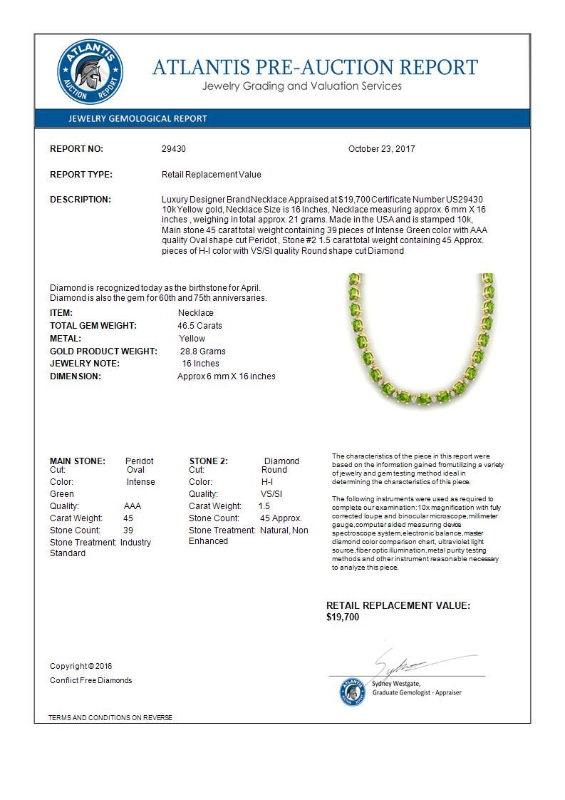 29430 - REF-275X3R ---- 46.5 CTW Peridot & VS/SI Certified Diamond Eternity Necklace 10K Yellow Gold ---- Luxury Designer Brand Necklace Appraised at $19,700 Certificate Number US29430 10k Yellow gold, Necklace Size is 16 Inches, Necklace measuring approx. 6 mm X 16 inches , weighing in total approx. 21 grams. Made in the USA and is stamped 10k, Main stone 45 carat total weight containing 39 pieces of Intense Green color with AAA quality Oval shape cut Peridot , Stone #2 1.5 carat total weight containing 45 Approx. pieces of H-I color with VS/SI quality Round shape cut Diamond