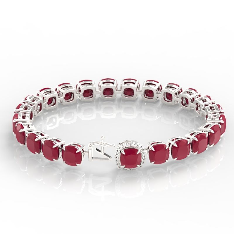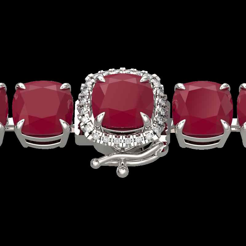 46 CTW Ruby & Micro Pave VS/SI Diamond Halo Designer Bracelet 14K White Gold ---- Luxury Designer Brand Bracelet Appraised Retail Price at $19,600 ---- SKU Number US23322 14k White gold Bracelet Size is 7 Inches, Bracelet measuring approx. 9 mm x 7 Inches, weighing in total approx. 14 grams. Made in the USA and is stamped 14k, Main stone 45.75 carat total weight containing 22 pieces of Mid-Opaque-Deep Red color with AAA quality Cushion shape cut Ruby , Stone #2 0.25 carat total weight containing 24 pieces of H-I color with VS/SI quality Round shape cut