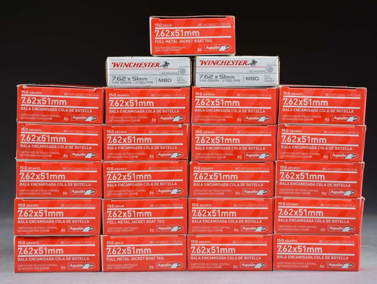 420 RDS. (21 BOXES) Aguila 150 gr. Full metal jacket boat tail. 40 RDS. (2 BOXES) Win. M80 148 gr. full metal jacket. CONDITION: most boxes sealed in near excellent condition. 1 opened box has serviceable appearing ammo. PROVENANCE: The Collection of Gun Sport Ltd owned by Jon R. Thomas. (02-20319/MD). $700-1,000.