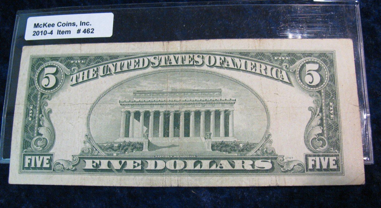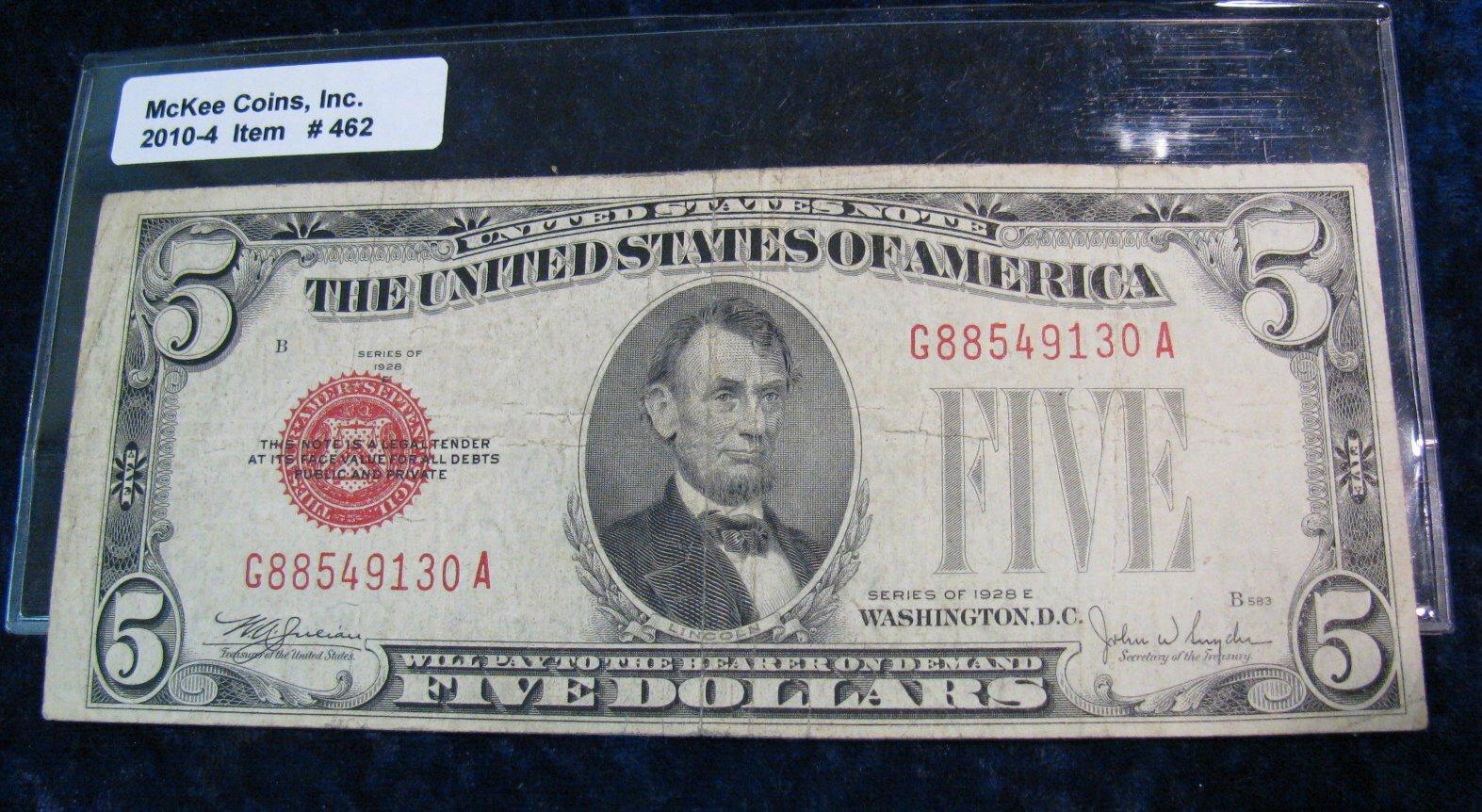 462. Series 1928E $5 U.S. Note. "Red Seal". VG-8.