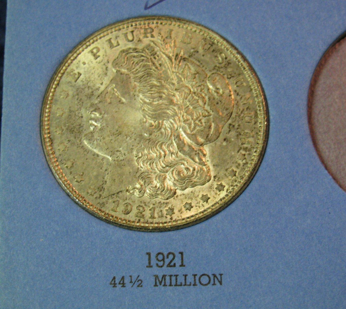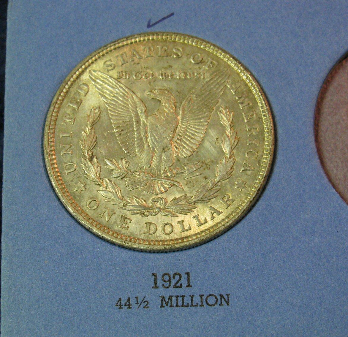 465. 1921 P Morgan Silver Dollar. Toned Uncirculated. Mounted in a Whitman folder.