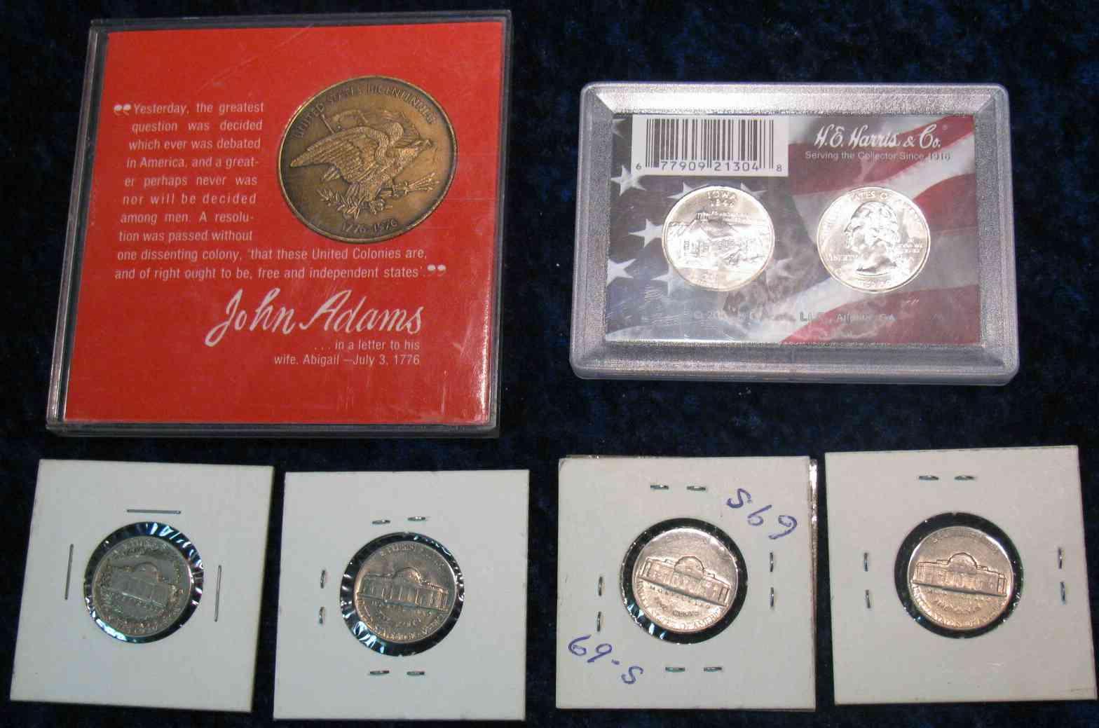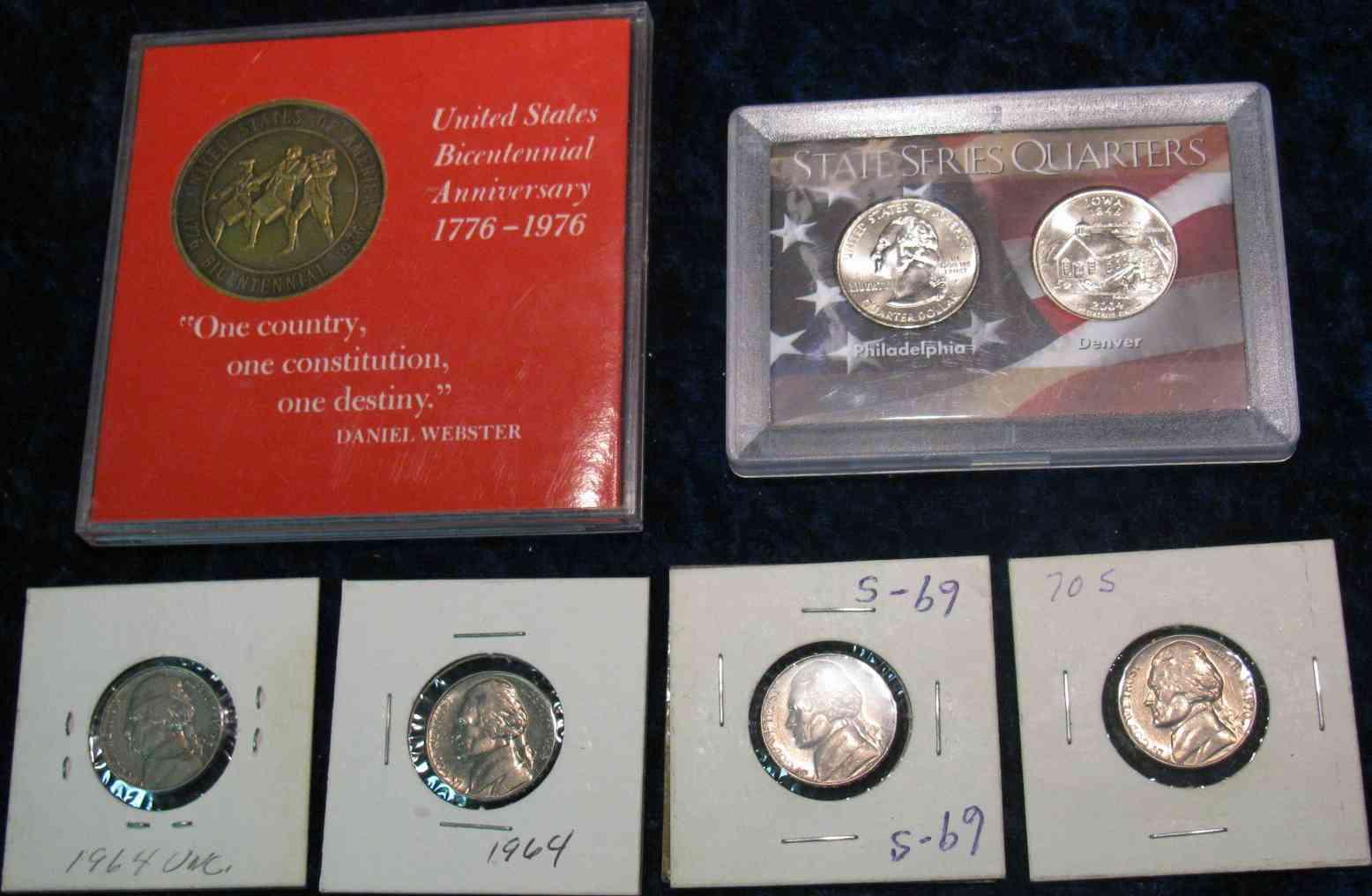 465. 1964 Nickel with Christmas Wreath engraved on reverse; Iowa State Quarter P & D Set; 1776-1976 U.S. Bicentennial Medal; & 1964P, 69S, & 70S BU Jefferson Nickels. All in holders.