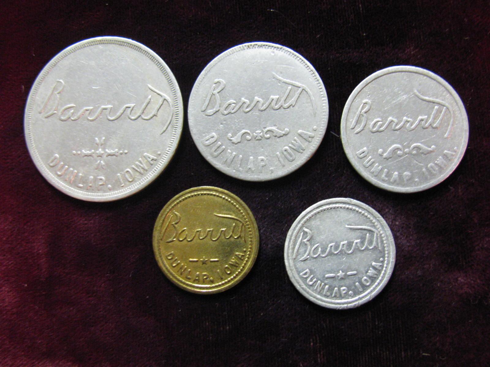 465." Barrrtt" Dunlop Iowa Set of 5 Good For Merchandise Tokens , 2, 5, 10, 25 Cent & $1 Token.