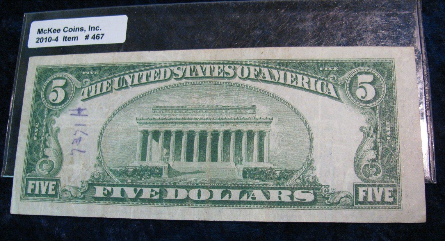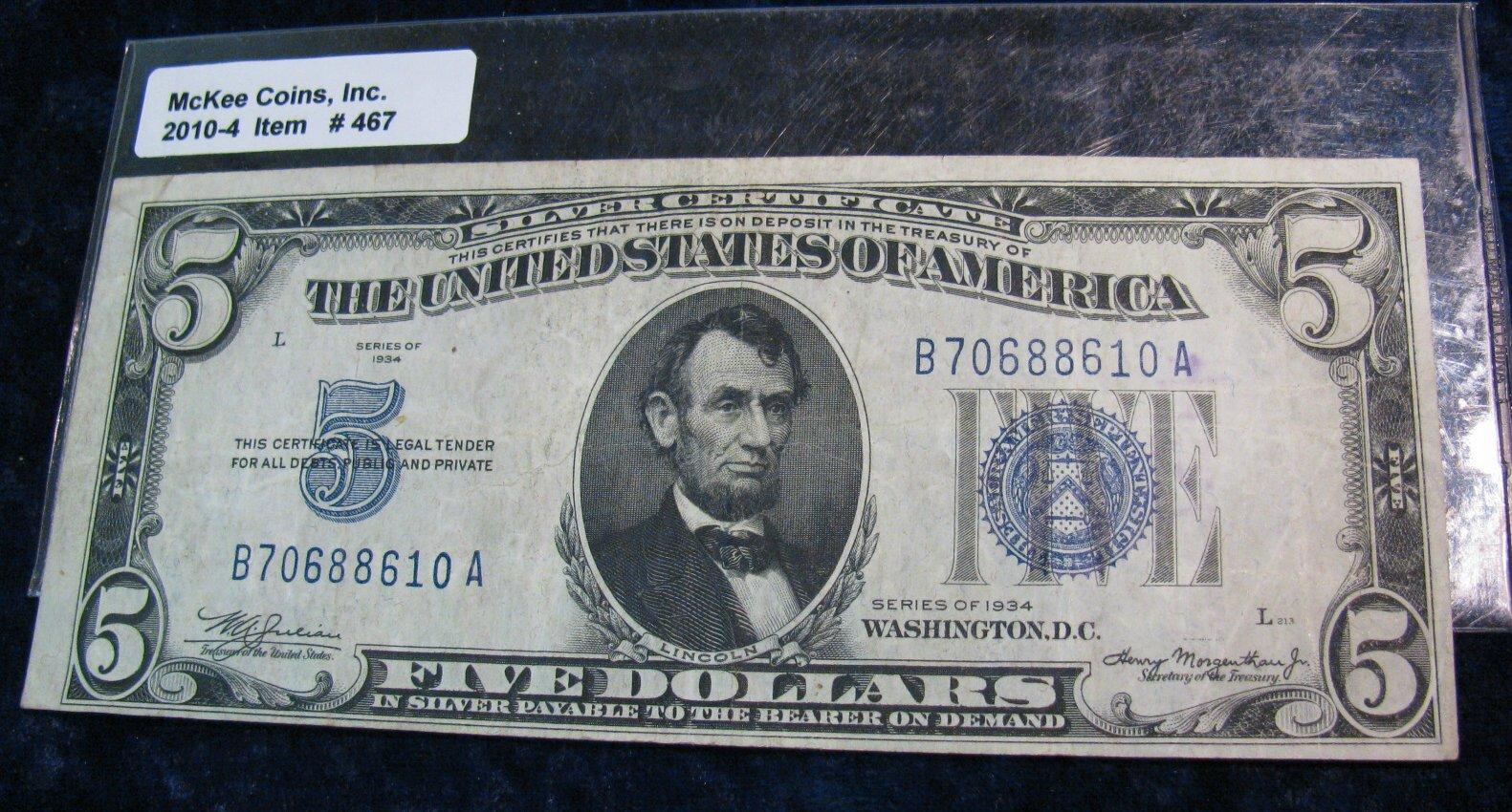 467. Series 1934 $5 Silver Certificate. F. Ink on reverse.