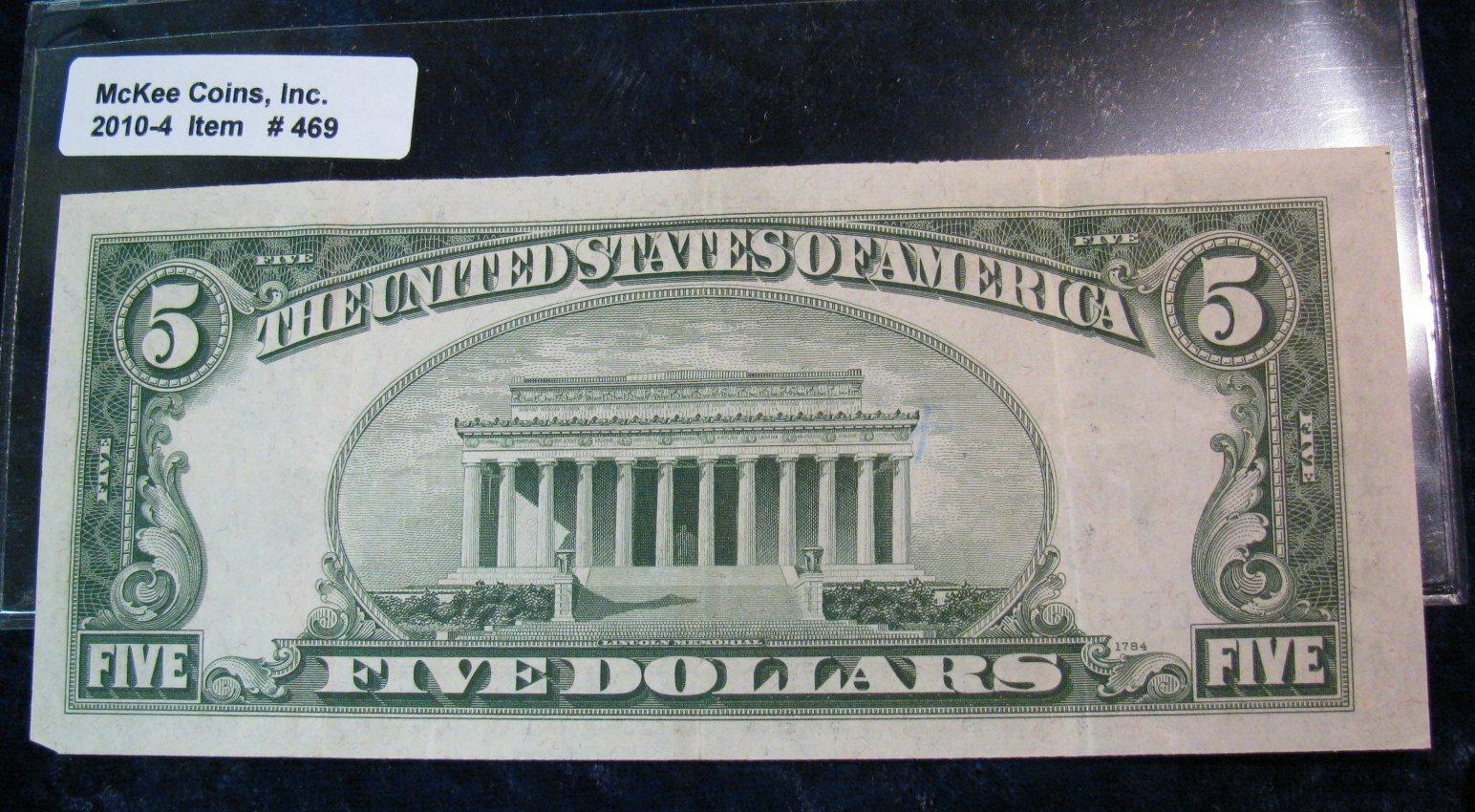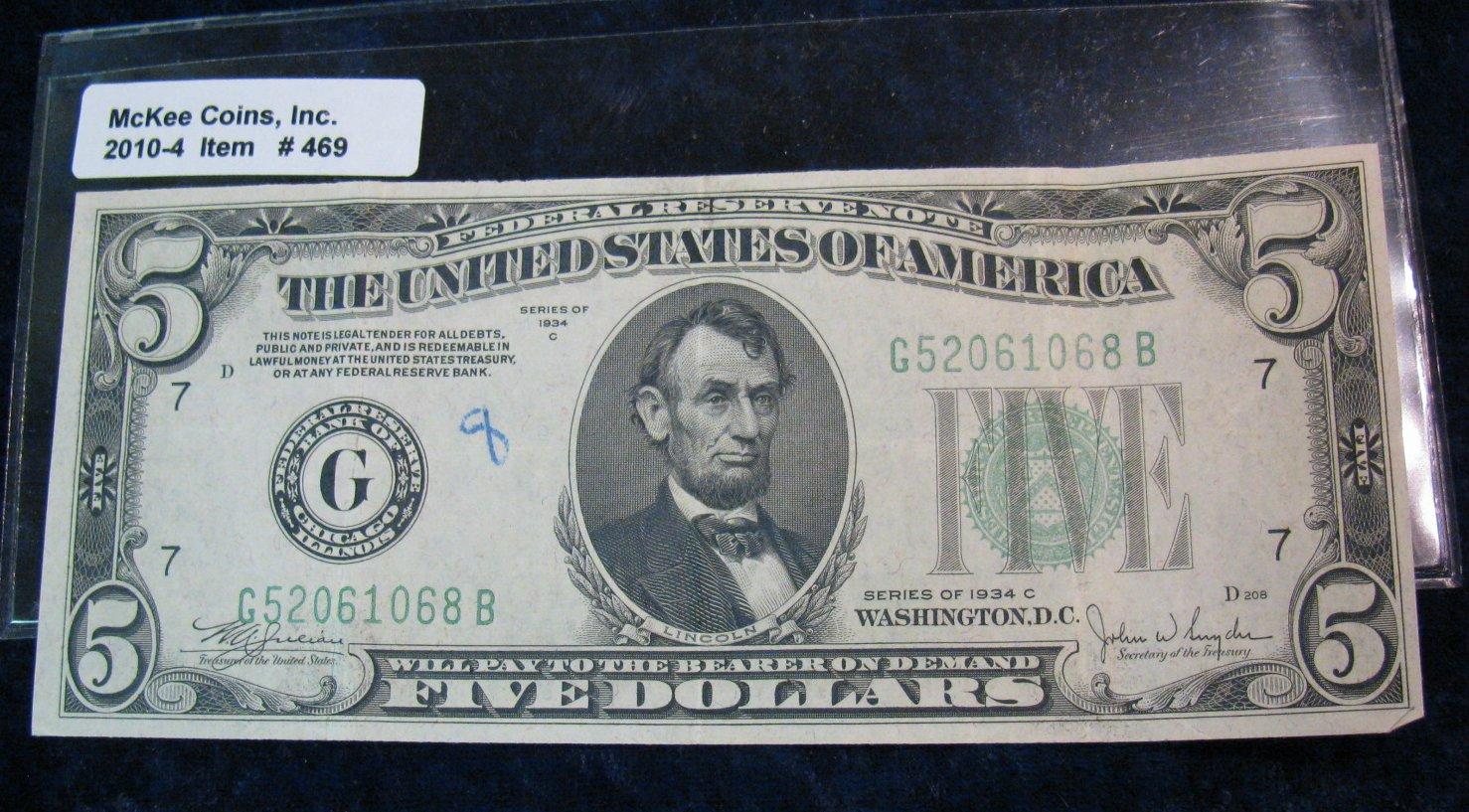 469. Series 1934C $5 Federal Reserve Note. VF. Ink on obv.