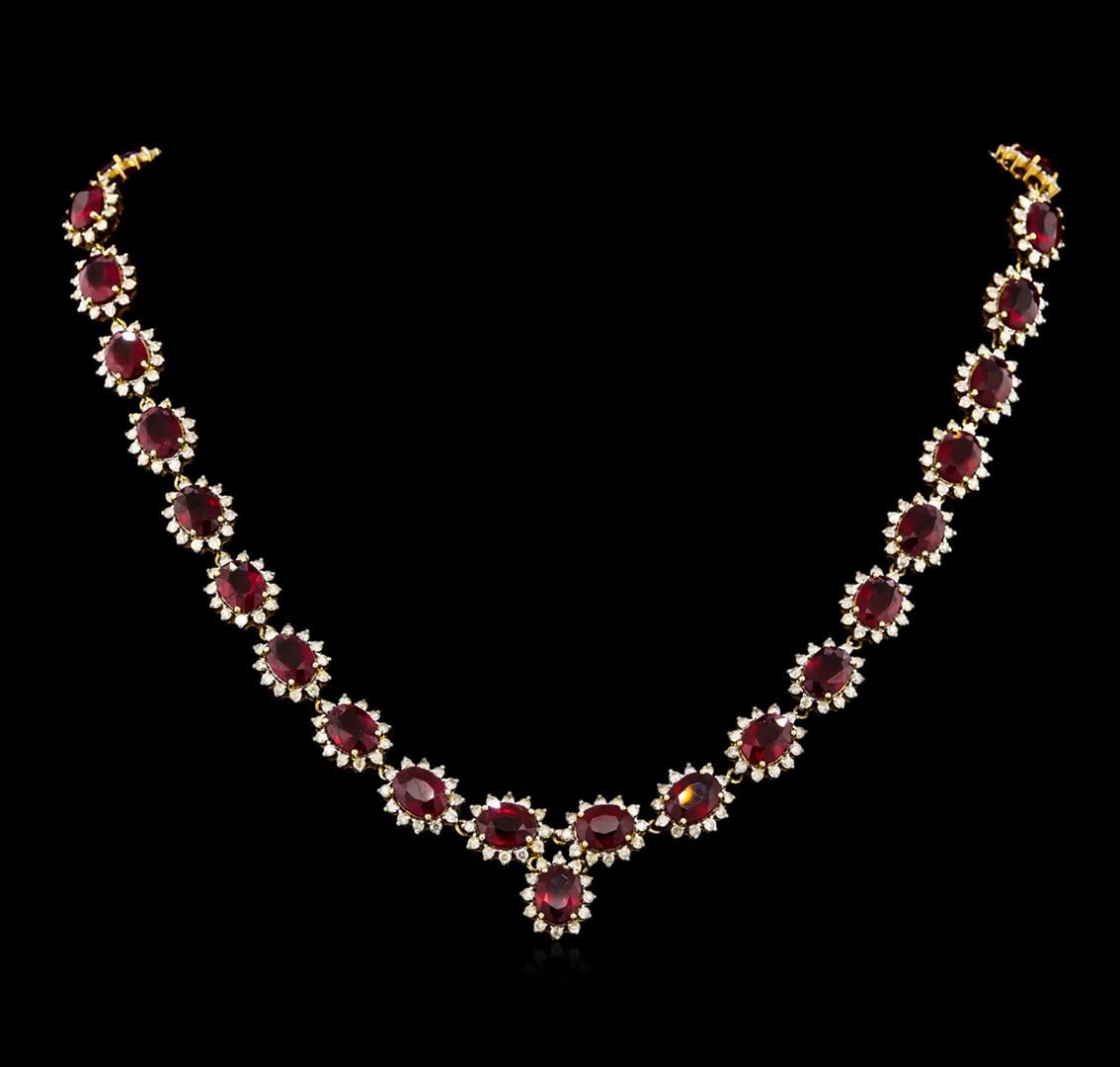 One 14k yellow gold ladies necklace (35.00 grams). Containing: 33 Natural Rubies. Weight: total 47.00 carats. Measurements: 8.10 x 6.05 x 3.70mm. Shape & Cutting: oval-shape, mixed-cut. Color: medium to dark red, very even color. Cut & Polish: very good. Transparency: transparent. 396 round, brilliant-cut diamonds total 8.54 carats in weight. Average quality is: I1 clarity grade; H-I color grade. GLS Appraised at $24,230.00.