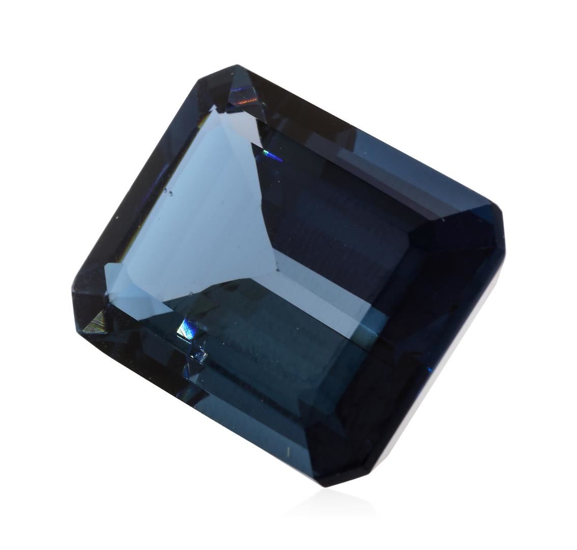 One natural emerald cut london blue topaz with an exact weight of 47.08ct., clarity is eye clean, dark greenish blue. Gemological Appraisals Services estimates the retail value at $1647.8 GAS Appraised.