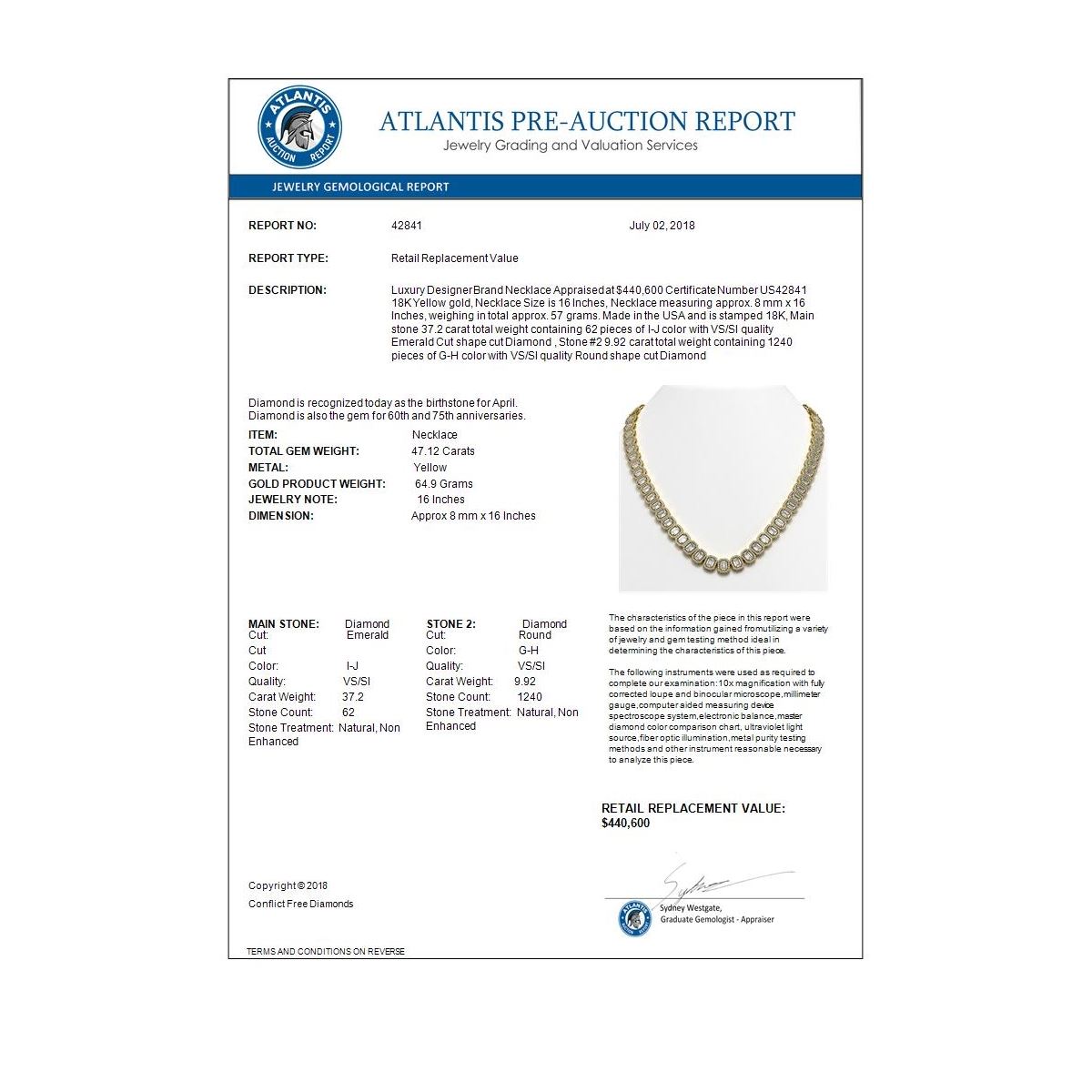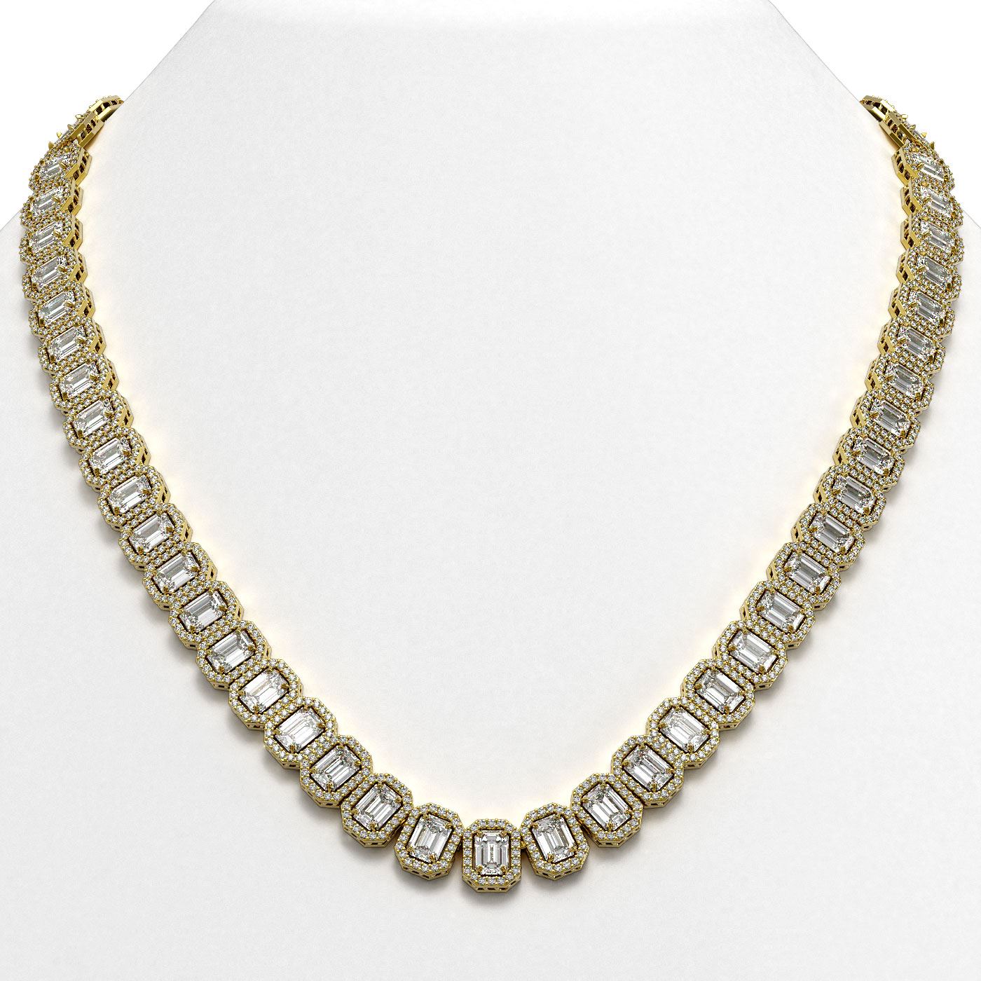 REF-10014Y2K -42841 ---- 47.12 CTW Emerald Cut Diamond Designer Necklace 18K Yellow Gold ---- Luxury Designer Brand Necklace Appraised at $440,600 Certificate Number US42841 18K Yellow gold, Necklace Size is 16 Inches, Necklace measuring approx. 8 mm x 16 Inches, weighing in total approx. 57 grams. Made in the USA and is stamped 18K, Main stone 37.2 carat total weight containing 62 pieces of I-J color with VS/SI quality Emerald Cut shape cut Diamond , Stone #2 9.92 carat total weight containing 1240 pieces of G-H color with VS/SI quality Round shape cut Diamond