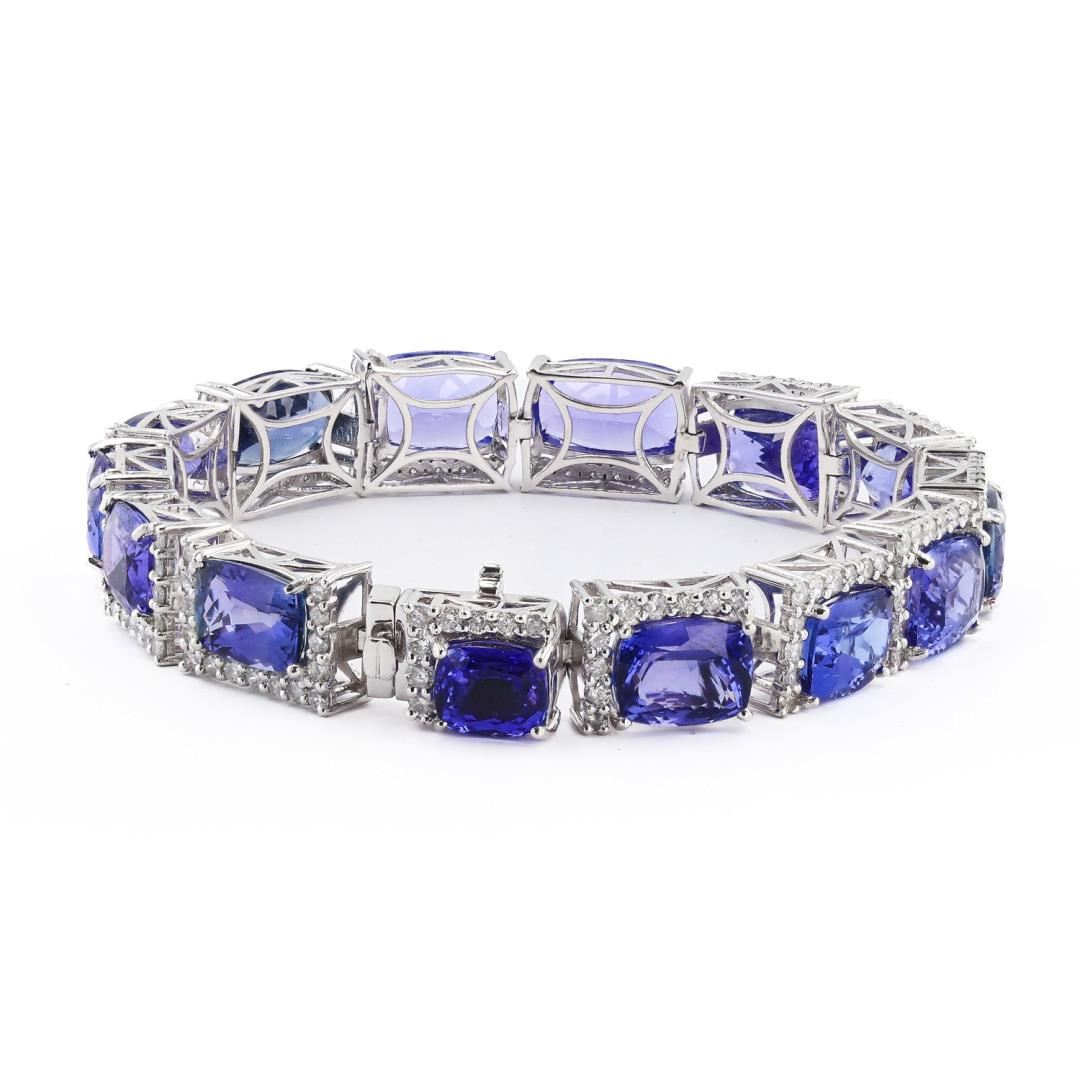 One polished, stamped. and tested platinum bracelet marked Oscar Friedman. The bracelet is mounted with: 14 genuine faceted tanzanite weighing approximately 47.44 carats, and 129 genuine round diamonds weighing approximately 3.72 carats. The bracelet measures 7 inches in length and is finished with a tension lock clasp and folding safety clasp. This item weighs 42.7 grams, condition is new, excellent workmanship. #MAIN GEMSTONES# Species: Zoisite Variety: Tanzanite Shape: Cushion Cutting Style: Modified Brilliant Cut Quantity: 14 Tanzanite Measurements: 8 x 7 - 12 x 8mm Total Weight: 47.44 carats Color: Violetish Blue Cut Grade: Very Good Refractive Index: 1.691 - 1.700 DR Birefringence: 0.008 - 0.013 Hardness: 6.5 - 7 #ADJACENT GEMSTONES ON BRACELET# Identity: Natural Diamond Shape: Round Cutting Style: Brilliant Cut Quantity: 129 Diamonds Measurements: 1.7 - 2.0mm Total Weight: 3.72 carats Clarity Grade: SI1-I2 Color Grade: H-I Refractive Index: 2.417 Hardness: 10 TOTAL TANZANITE WEIGHT: 47.44 cts TOTAL DIAMOND WEIGHT: 3.72 cts WEIGHT OF ITEM: 42.7 grams METAL: Platinum #LREF-31112