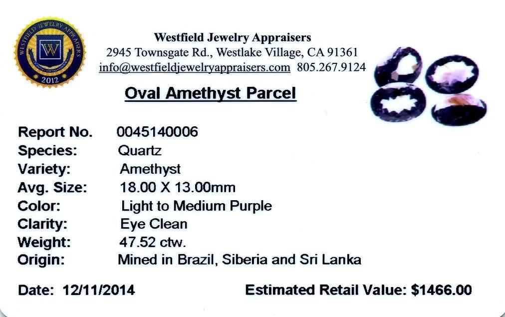 47.52ctw. Oval Amethyst Parcel Westfield Appraised at $1,466.00.