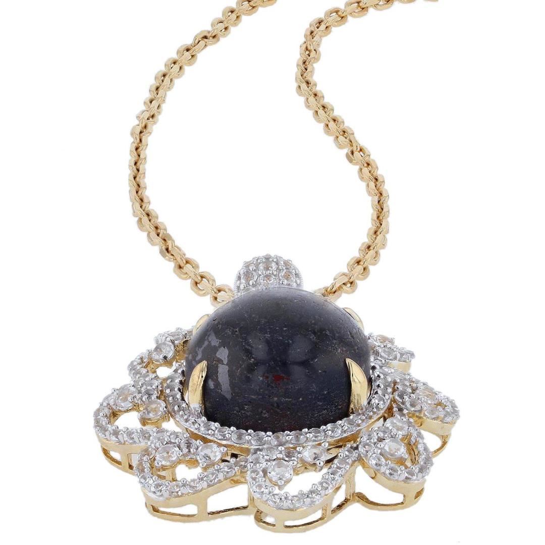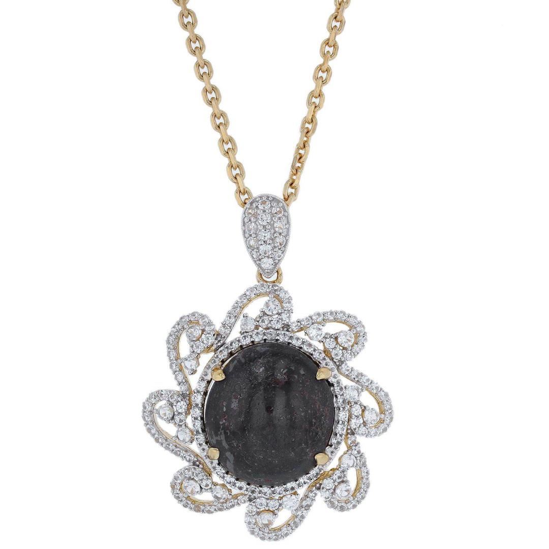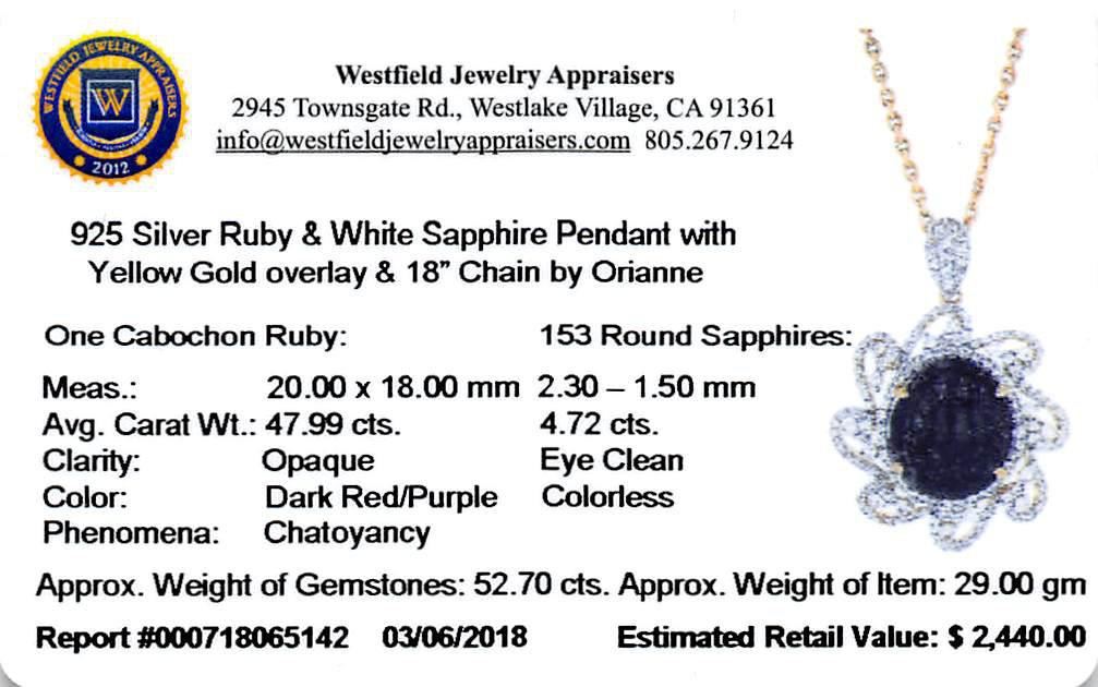 Electronically tested 925 silver ladies cast & assembled ruby and sapphire pendant and chain with gold overlay. 18" length. Trademark is Orianne. Identified with markings of "925". Condition is new, good workmanship. Containing: One prong set oval cabochon cut natural ruby with chatoyancy phenomena, measuring 20.00 x 18.00 x 11.70mm, approximate weight of 47.99ct., type II, dark, brownish, strongly purplish red color, (GIA stpR 7/1), cut is good. One hundred fifty-three prong set round mixed cut natural white sapphires, measuring 2.30 - 1.50 x 1.24 mm, approximate total weight of 4.71ct., clarity is eye clean, colorless, very slightly grayish, white color, (GIA W 0/3), cut is good. Total Weight of Colored Stones 52.70 ct. Total Weight of Pendant With Chain 29.00 gm