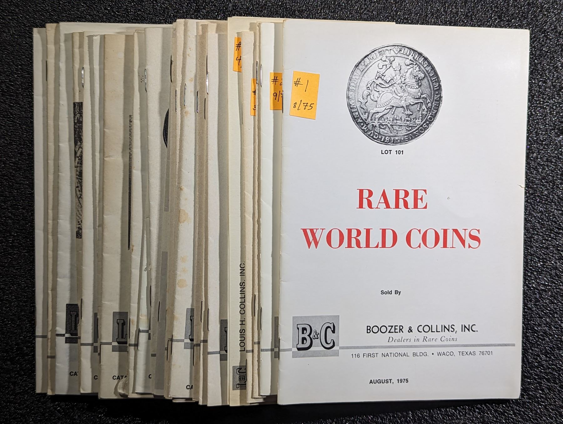 (1) Boozer & Collins, Inc. Catalog # 1. Rare World Coins. August 1975. 1-456 Lots. 12mo. original card covers. Fixed Price List. Waco. 5 Pages. 19 b&w coin plates. Fine.