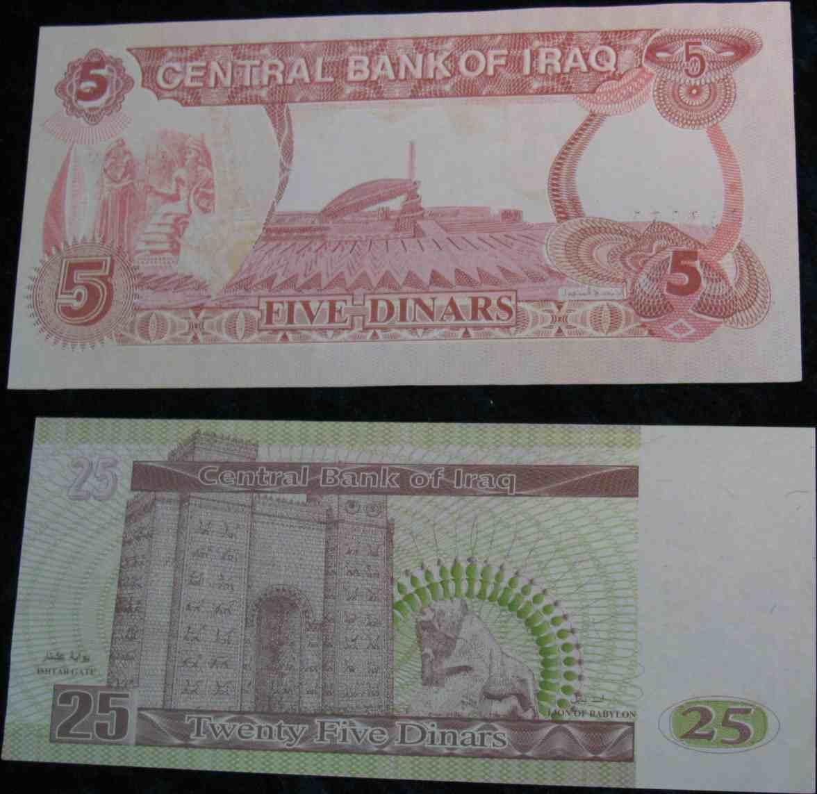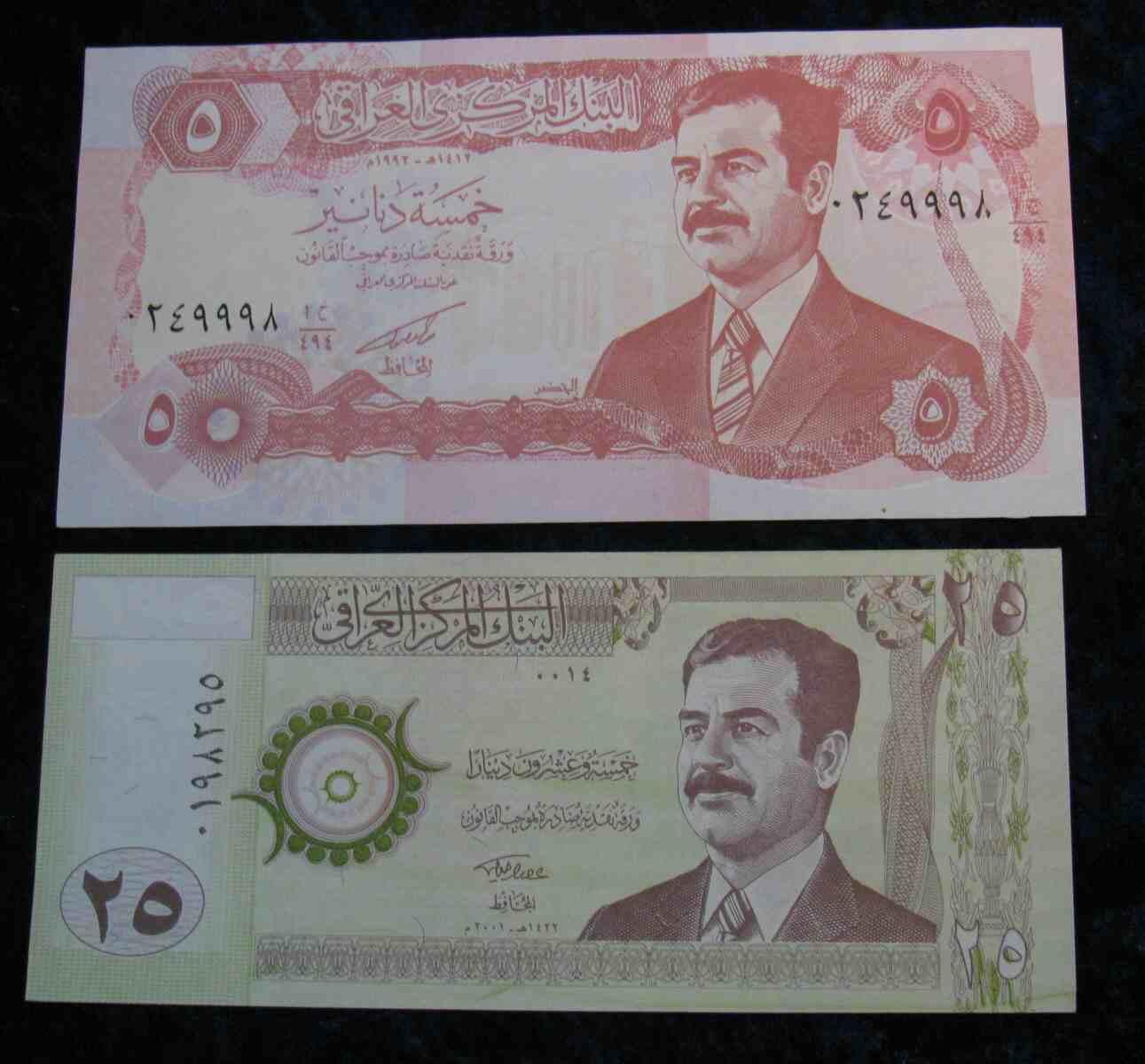 47. Iraq Five & 25 Dinars Banknotes. CU. Depict Saddam Hussein.