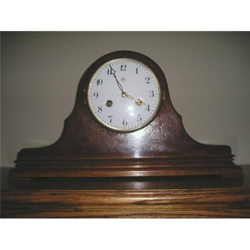 </font></strong>Marked inside clock Wurttemberg; B26; UNGHANS. It has a two-toned finish with a burl front. The stain appears to have a semi-gloss. A tiny discoloration on back right side, no bigger than a thumb print. There is no chime compartment. It will keep excellent time. What a lovely piece to have adorning your shelf, table or mental!!</font>