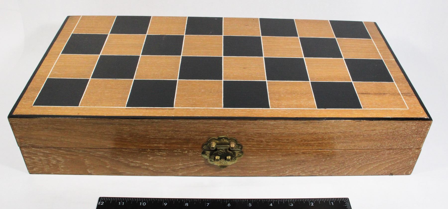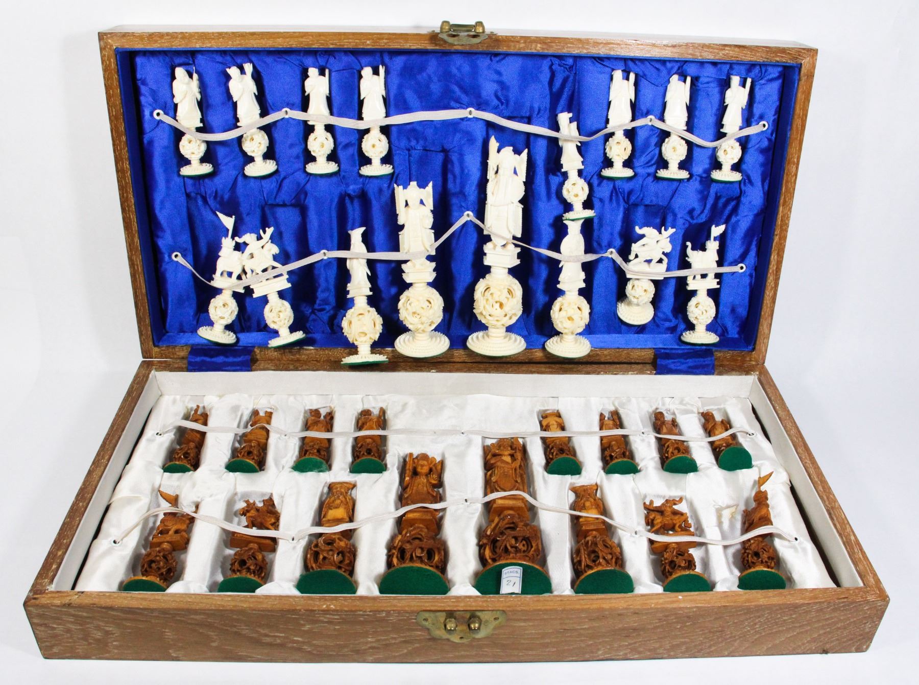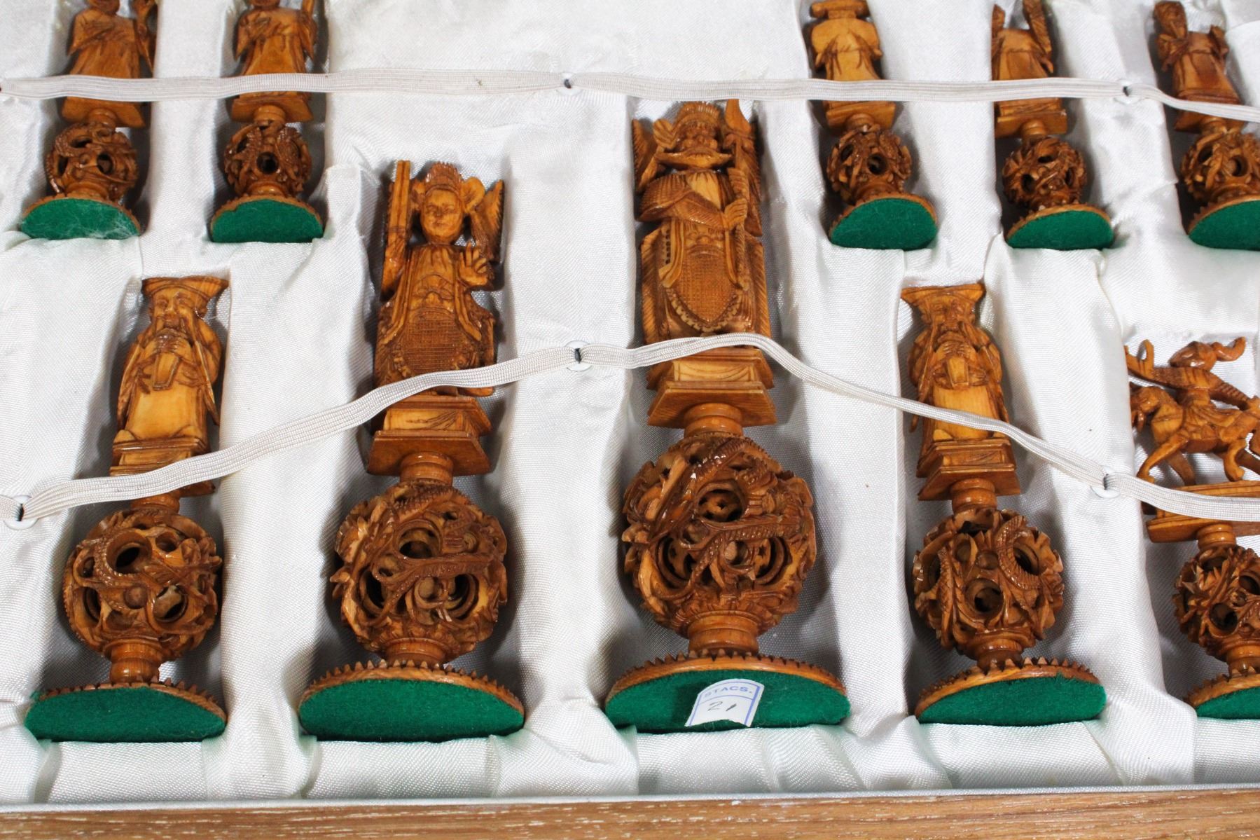 HAND CARVED THAILAND CARVED WOOD AND FAUX IVORY CHESS SET COMPLETE IN FOLDING WOODEN BOX/CHESS BOARD 1960'S 1970'S VINTAGE CHESS SET - ONE PIECE HAS WEAR AND REQUIRES REPAIR