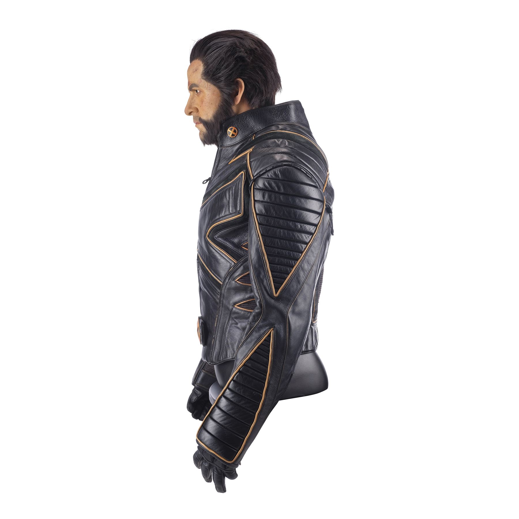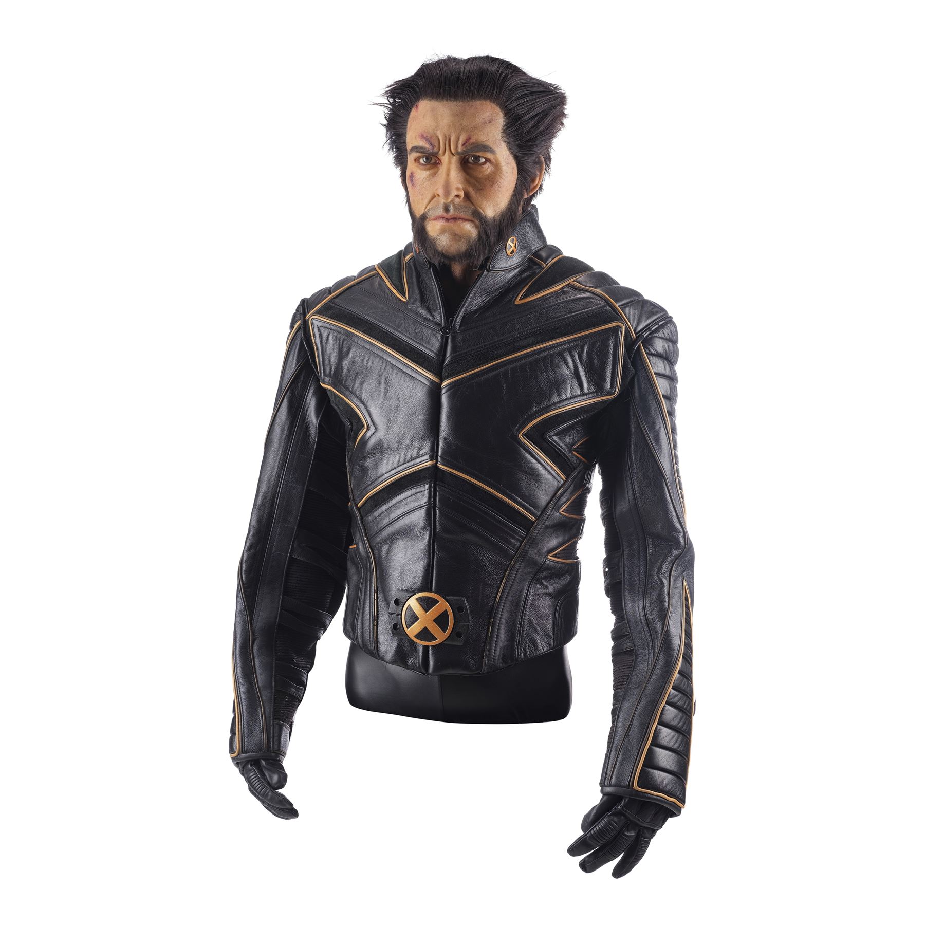 This stunt jacket is made of black leather with suede and faux leather panels, as well as orange piping. It has a zip front closure backed by a heavy-duty self-adhesive strip. The jacket features a resin X-Men symbol on the collar, and one at the waist. It comes displayed on a custom-built mannequin torso bearing Hugh Jackman's likeness as Wolverine with production-added SFX blood and wounds on silicone skin. It comes with hand-punched brown hair and acrylic eyes. Replica gloves were added to complete the display. This jacket exhibits peeling and flaking faux leather, and tearing at the back of the arm holes. Dimensions: 29" x 22" x 34" (73.75 cm x 56 cm x 86.5 cm)